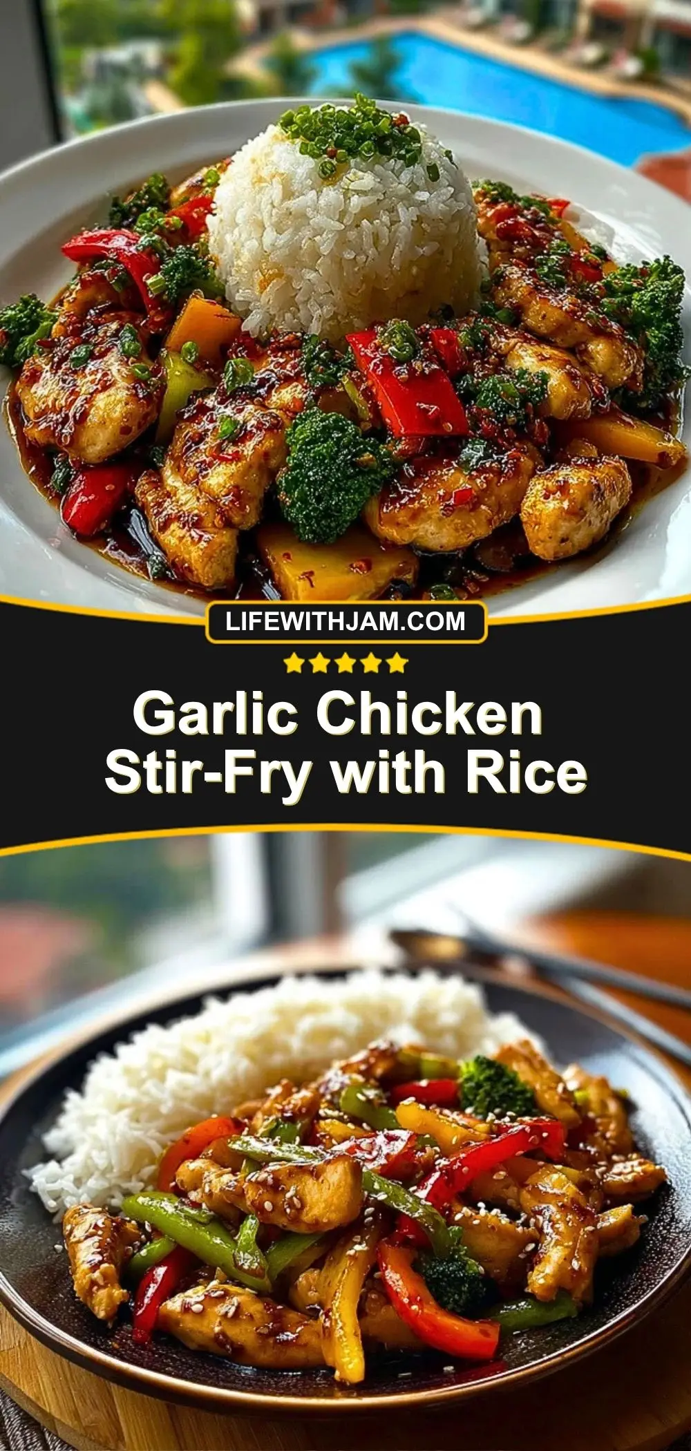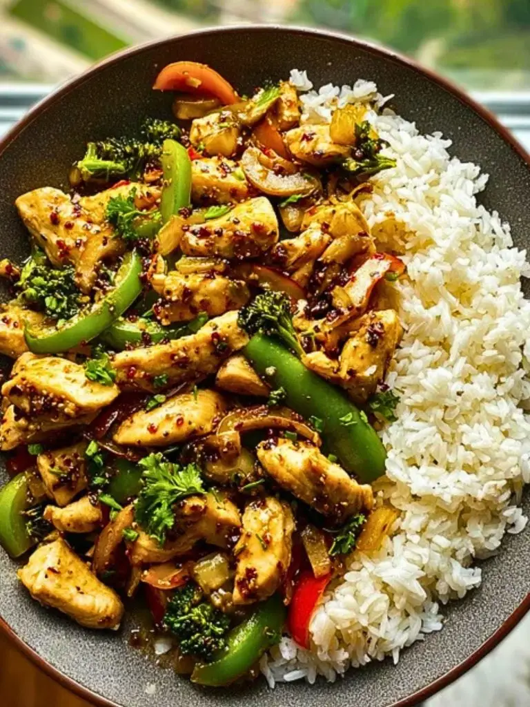 This Garlic Chicken Stir-Fry with Rice is quick, colorful, and loaded with bold flavor. Juicy chicken strips are coated in a savory garlic sauce, paired with vibrant vegetables and served over fluffy jasmine or basmati rice. It’s a one-pan dinner that’s easy to prepare and even easier to love.
