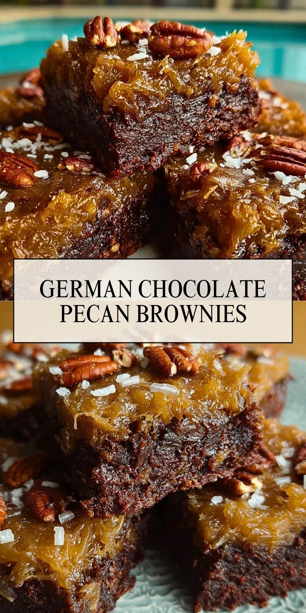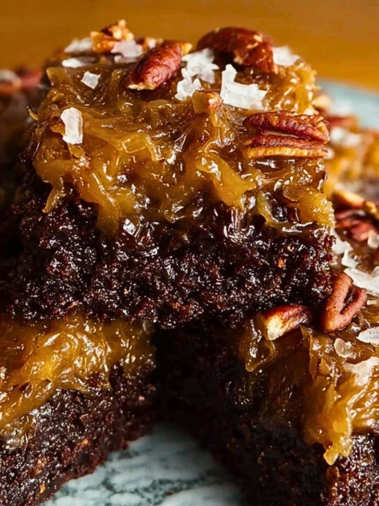 Fudgy, decadent, and topped with gooey coconut-pecan frosting, these German Chocolate Pecan Brownies are everything you want in a brownie—and then some. Imagine the richness of dark chocolate meeting the classic caramelized crunch of German chocolate cake filling. Each bite is a blend of silky, chewy brownie with a satisfying, nutty topping that clings like caramel and finishes with a touch of sea salt.