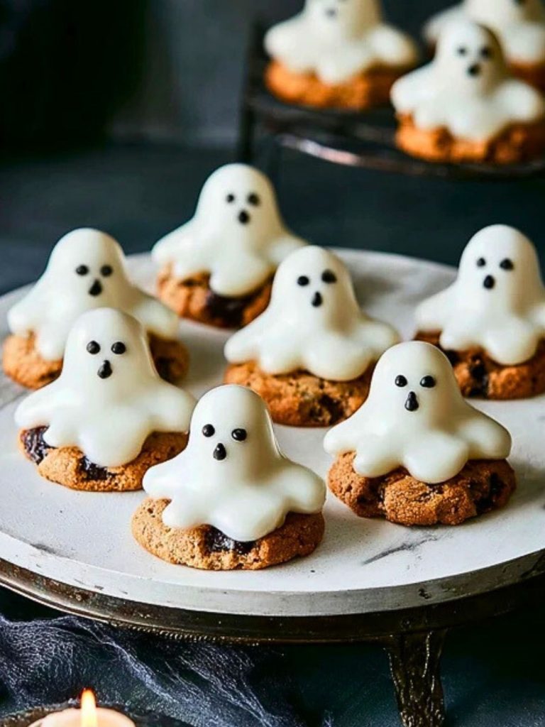 These Ghost Cookies are the ultimate spooky-sweet treat for Halloween. Each cookie features a soft chocolate chip base topped with a ghostly marshmallow figure, carefully draped in white chocolate to create a hauntingly adorable dessert. They’re cute, a little eerie, and absolutely delicious—perfect for parties, bake sales, or a fun kitchen project with kids. The combination of rich cookie dough and silky-smooth white chocolate makes each bite a festive favorite.