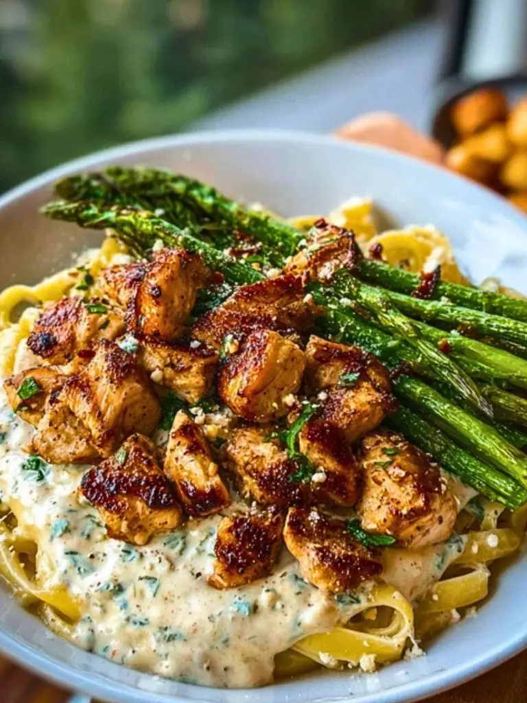 This Greek Chili Chicken Alfredo recipe is the kind of meal that makes you stop mid-bite and close your eyes in pure joy. Tender, spiced chicken seared to golden perfection, served with crispy Parmesan asparagus and golden-roasted potatoes, all crowned with a velvety smoked feta cream sauce. It’s an impressive plate that comes together with everyday ingredients, bold flavor, and rustic elegance.