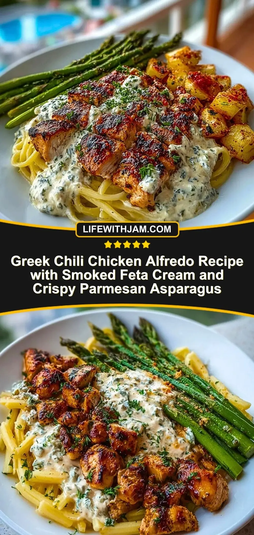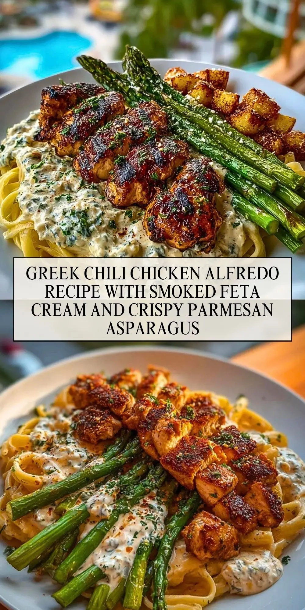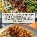 Greek Chili Chicken Alfredo Recipe with Smoked Feta Cream and Crispy Parmesan Asparagus