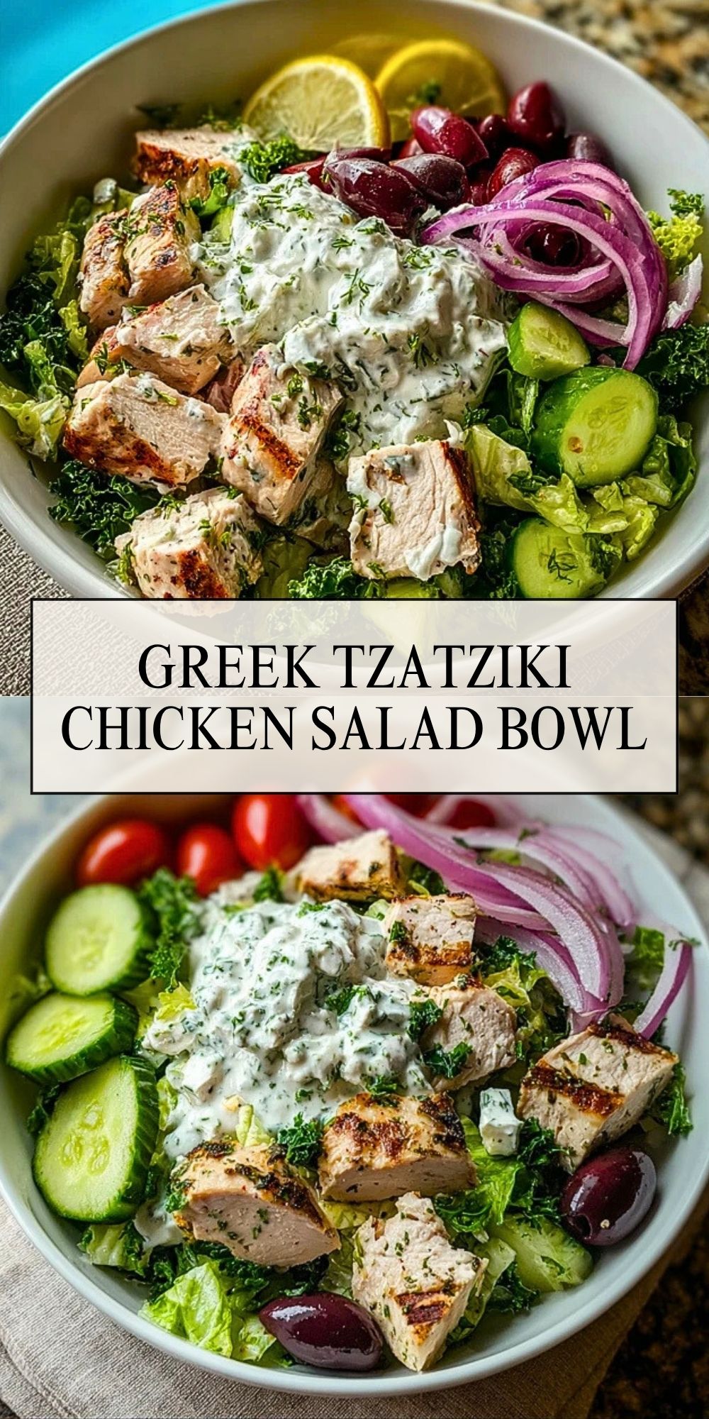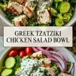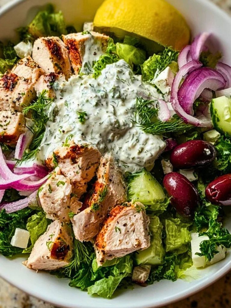 A fresh and flavorful Greek Tzatziki Chicken Salad Bowl loaded with grilled herb-marinated chicken, crisp greens, cucumbers, olives, and a generous dollop of creamy homemade tzatziki. Perfect for lunch, dinner, or meal prep!