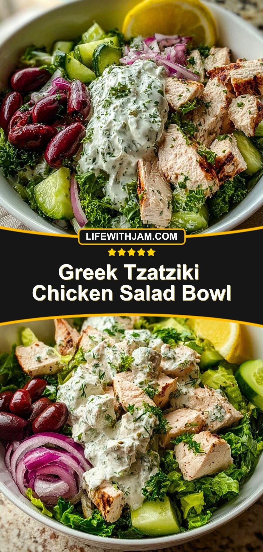 This Greek Tzatziki Chicken Salad Bowl is what weekday lunch dreams are made of. Grilled herb-marinated chicken, crunchy romaine and kale, crisp cucumbers, briny olives, and a lemony pop of red onion come together under a creamy blanket of homemade tzatziki. It’s fresh, it’s filling, and it might just become your favorite way to enjoy a Mediterranean-inspired meal at home.