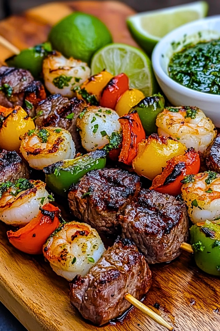 These Grilled Surf & Turf Skewers with Chimichurri are the perfect marriage of smoky steak and tender shrimp, brought to life with vibrant bell peppers and finished with a bold, garlicky chimichurri sauce. Ideal for summer grilling and easy entertaining.