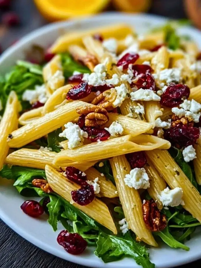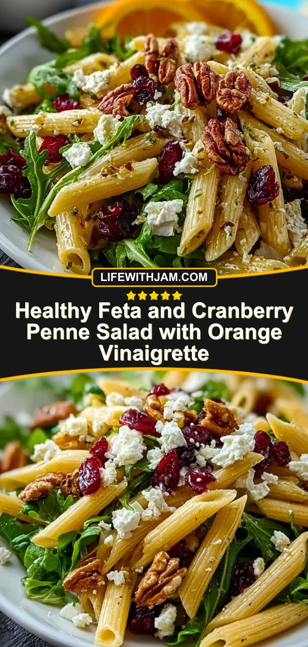 This Healthy Feta and Cranberry Penne Salad with Orange Vinaigrette is a vibrant, wholesome salad made with tender pasta, peppery arugula, creamy feta, sweet dried cranberries, and toasted pecans—all brought together with a fresh and zesty homemade orange vinaigrette. Perfect for meal prep, potlucks, or light dinners!