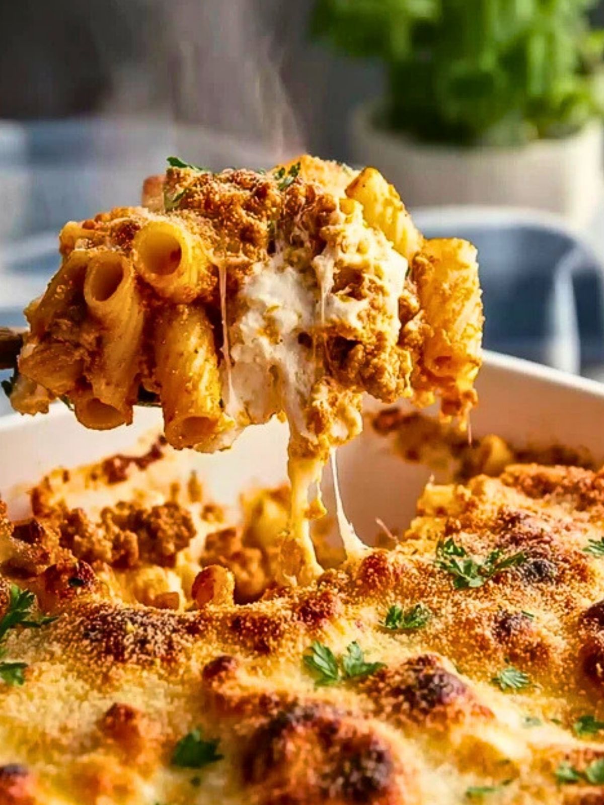 Let the baked ziti rest for 5–10 minutes before serving. Garnish with fresh parsley or basil, if desired.