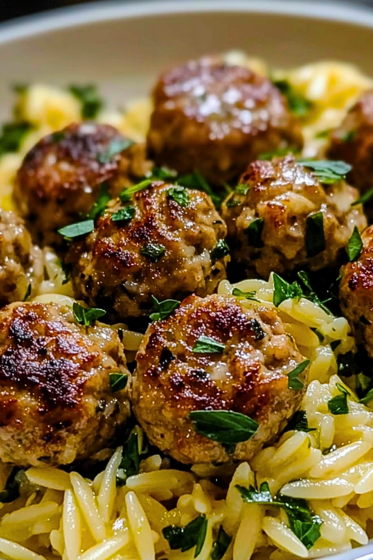 Juicy, herb-packed meatballs paired with zesty lemon orzo make this dish feel like a sun-soaked getaway to the Mediterranean. The meatballs are seared to golden perfection, infused with garlic, oregano, parsley, and mint, while the orzo takes on a vibrant brightness from lemon zest and fresh herbs. Crumbled feta adds creamy saltiness to tie it all together.