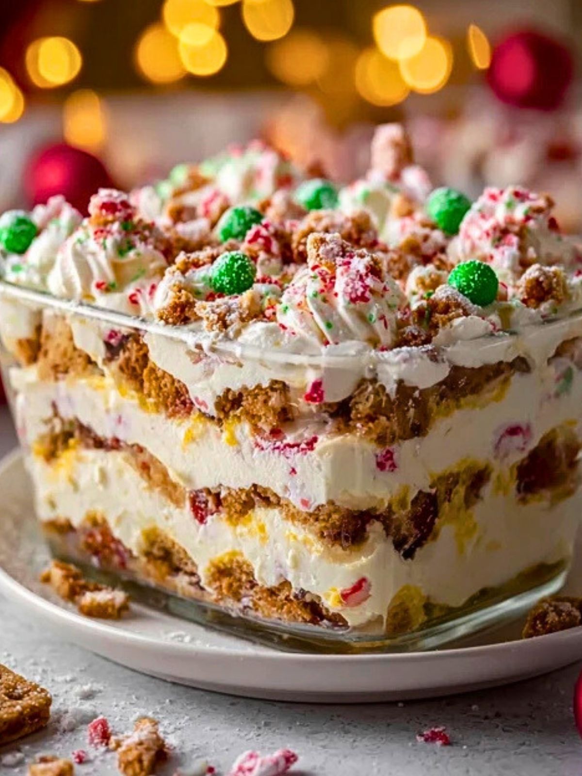 Sprinkle crushed peppermint candies or holiday sprinkles generously on top. Add mini holiday candies or gumdrops for extra flair. Cover and chill the lasagna in the fridge for at least 4 hours, or overnight for best results.
