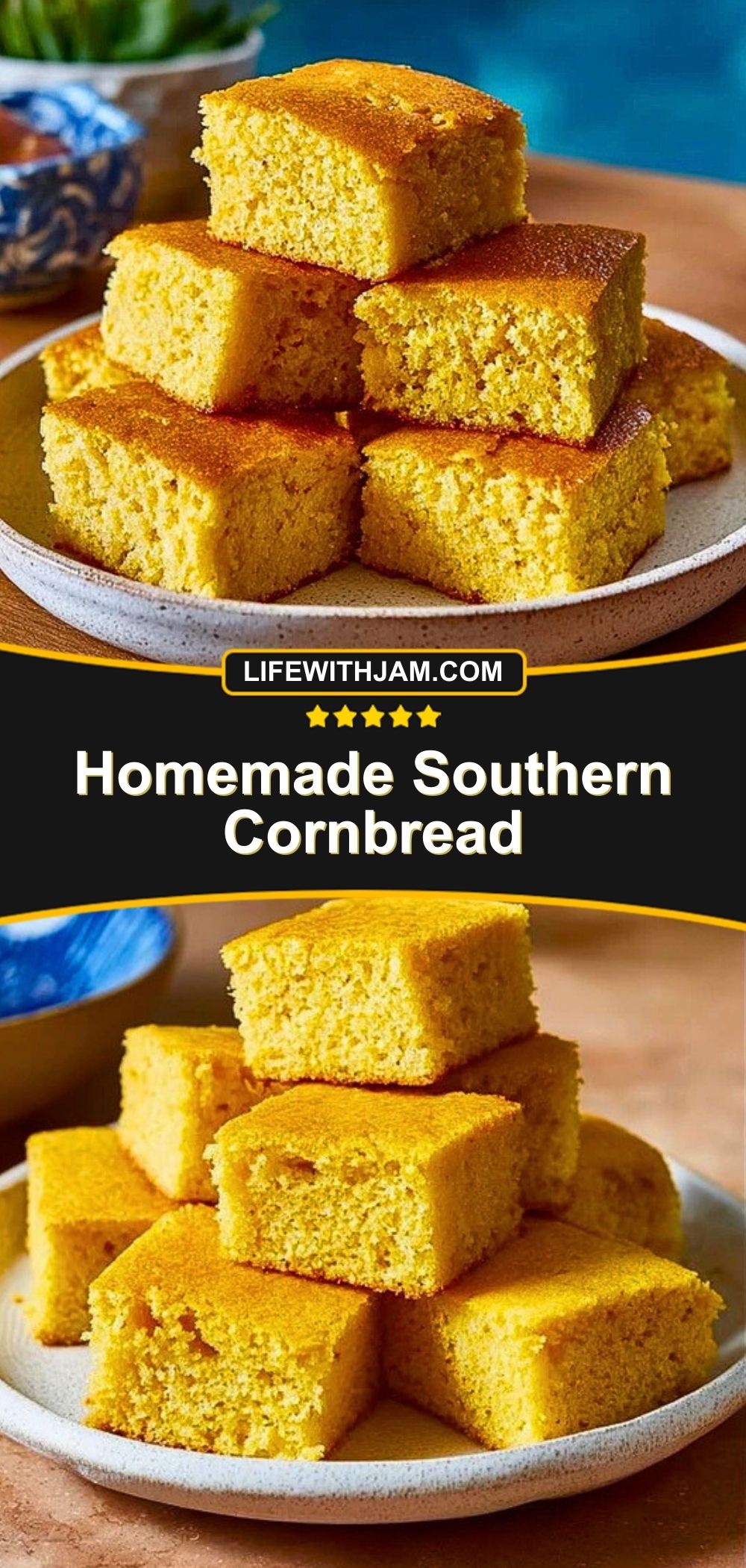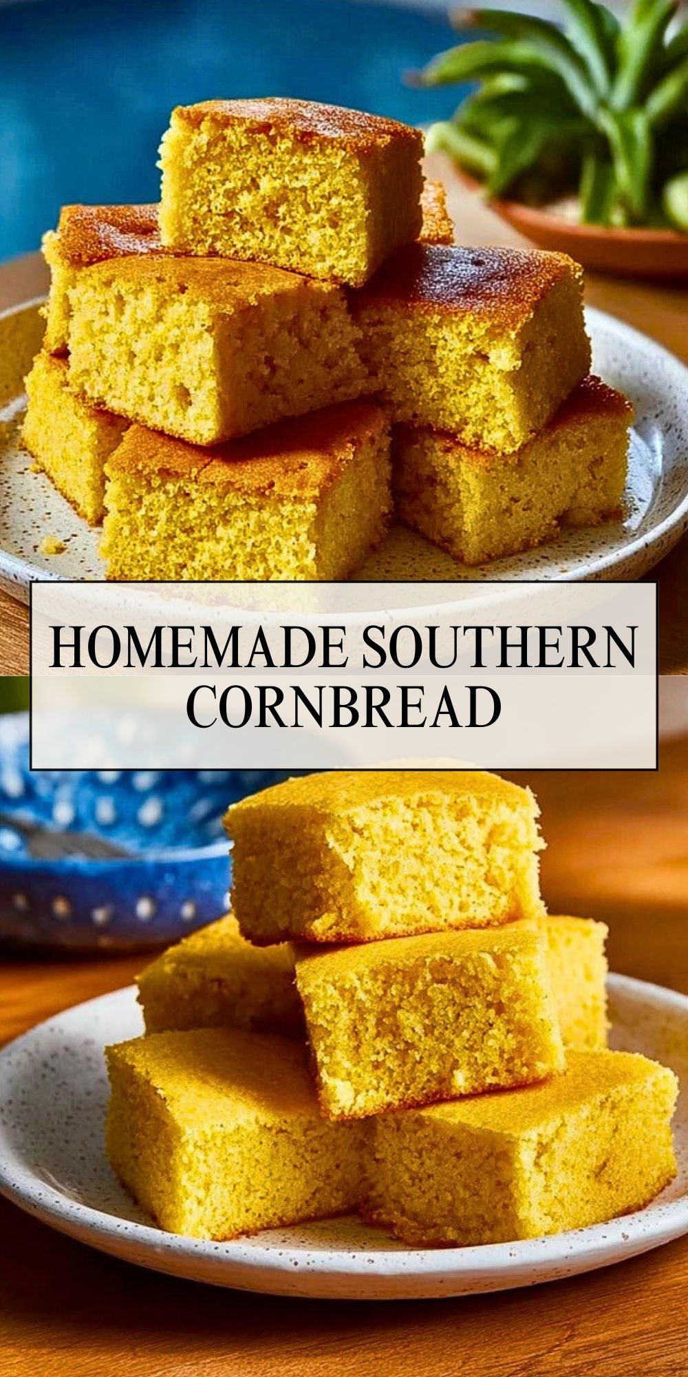 A golden, tender cornbread with a crisp edge and soft, moist interior — this Southern classic is perfect as a side for chili, BBQ, or eaten on its own with a pat of butter. Simple, quick, and loaded with comforting flavor.