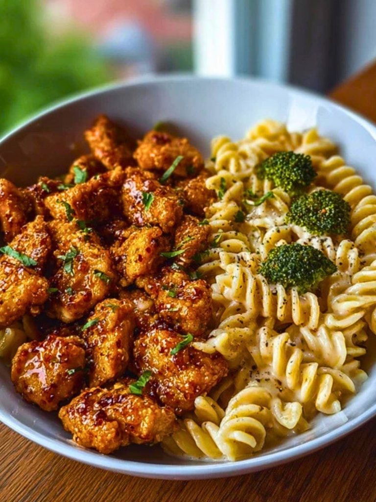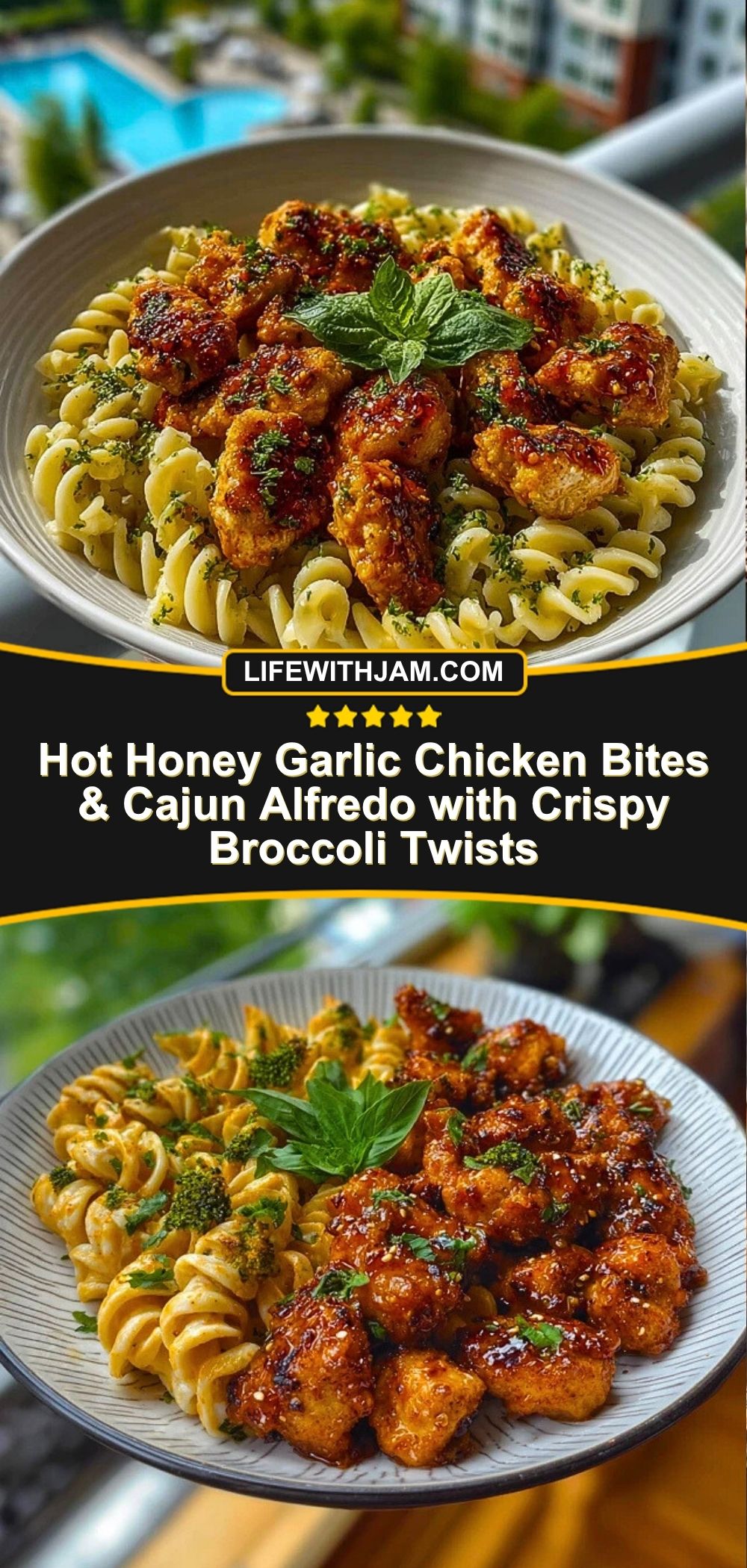 When comfort food meets bold flavor, you get this irresistibly craveable dish: Hot Honey Garlic Chicken Bites paired with creamy Cajun Alfredo pasta and crispy broccoli twists. It’s spicy, sweet, creamy, and savory—everything you want in a hearty dinner bowl.