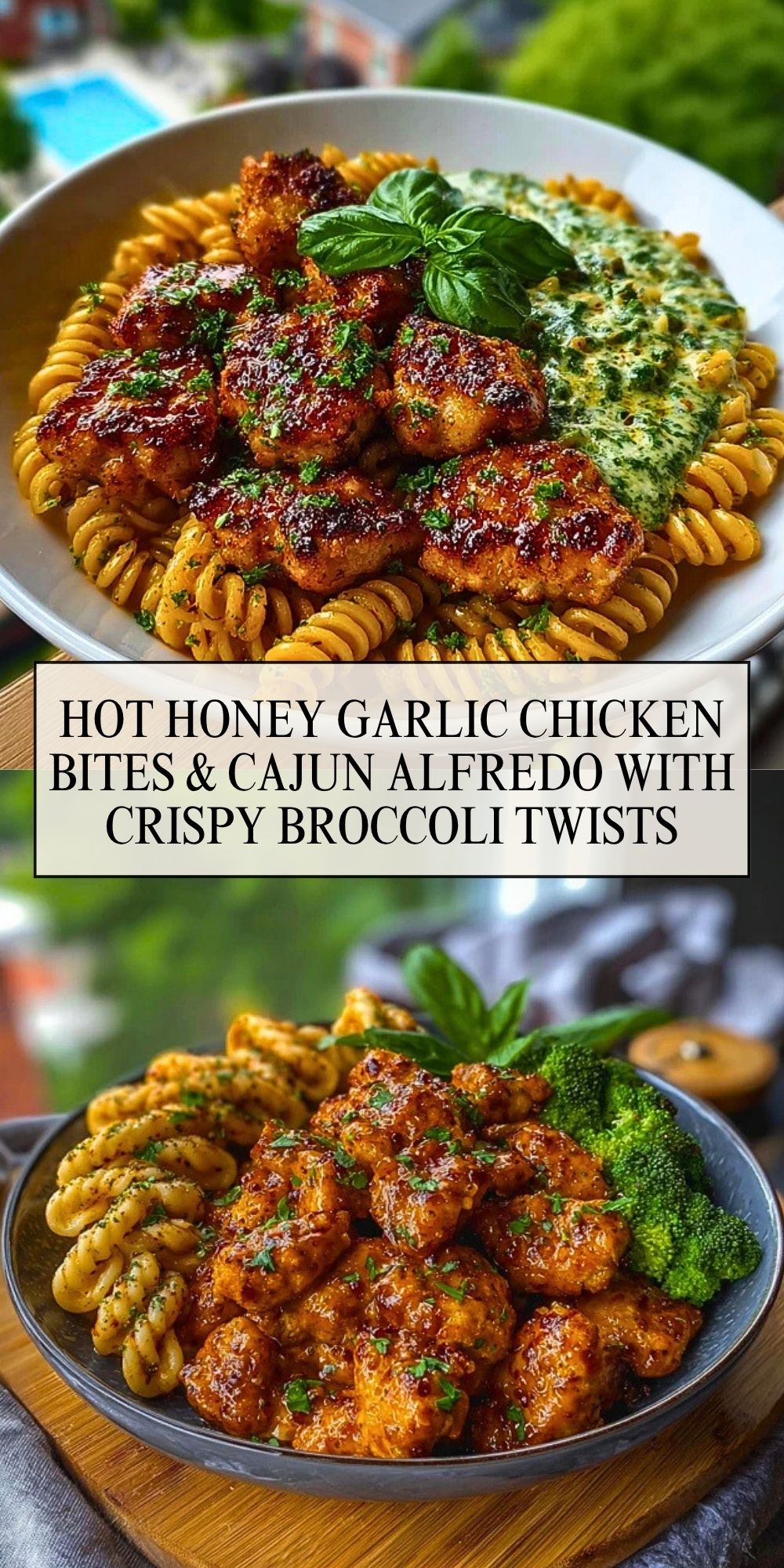 Hot Honey Garlic Chicken Bites & Cajun Alfredo with Crispy Broccoli Twists