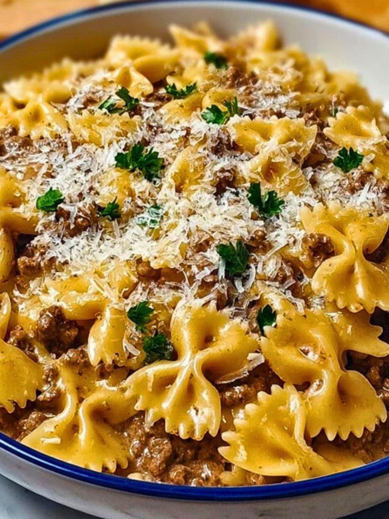A rich, creamy pasta dish made with tender bowtie noodles, seasoned ground beef, garlic, and a luscious Parmesan sauce. It’s cozy, indulgent, and perfect for weeknights or when you need a fast but comforting dinner.