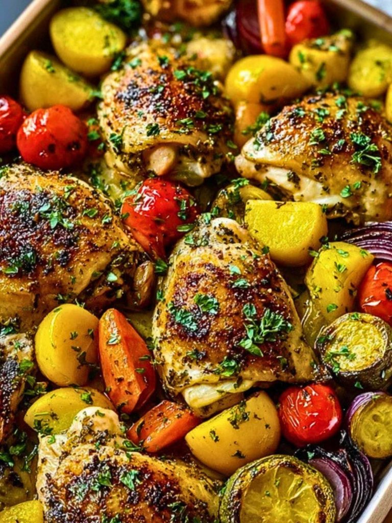 This one-pan herb chicken and roasted veggie bake is a wholesome, colorful, and flavor-packed dinner made with tender chicken thighs, vibrant vegetables, and a rustic herb marinade. It’s perfect for busy nights or meal prep, all while delivering maximum comfort with minimal effort.