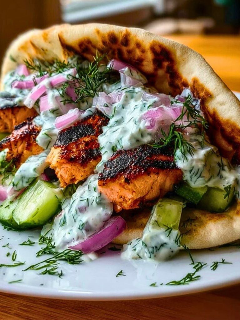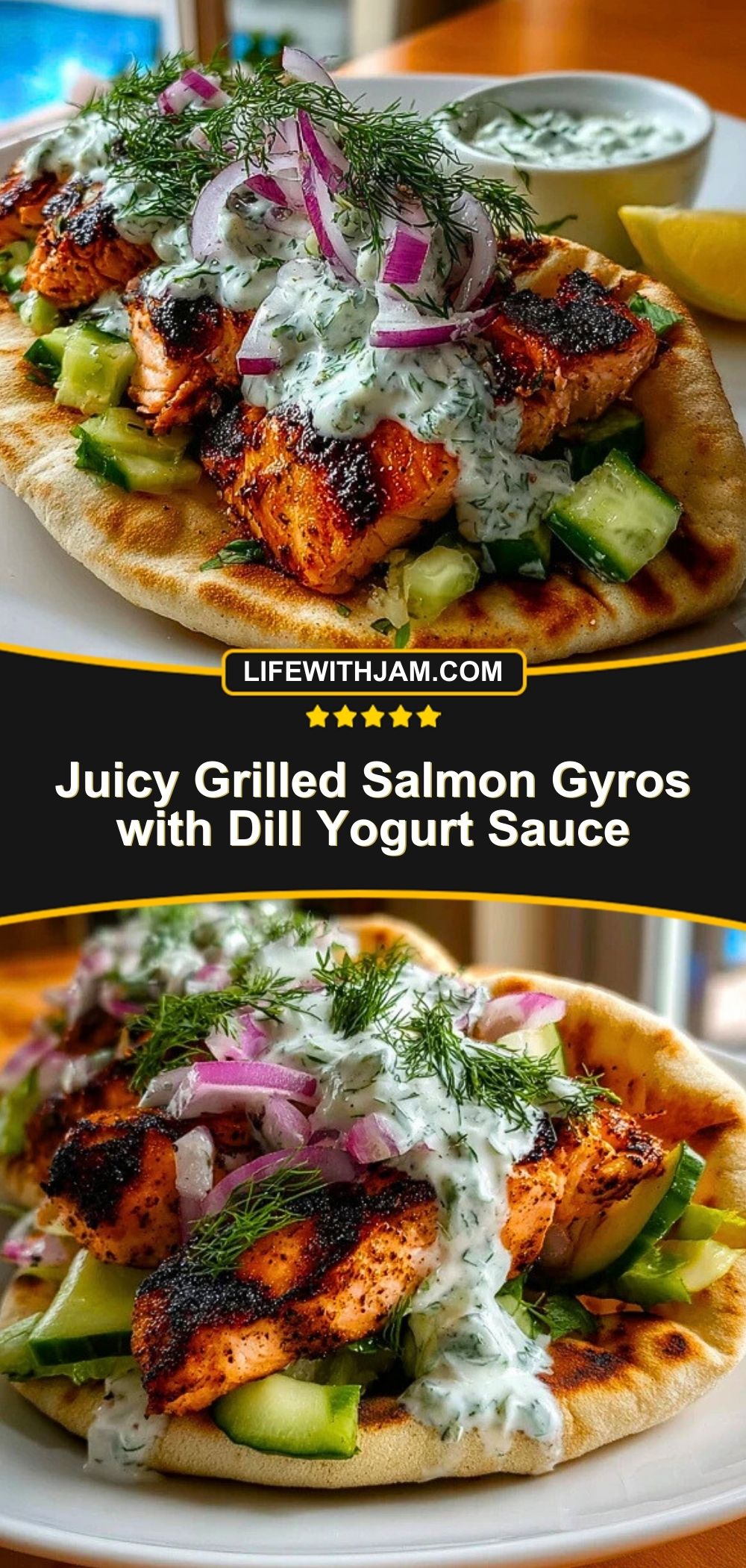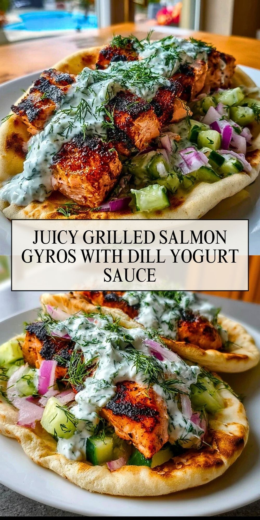 Juicy Grilled Salmon Gyros with Dill Yogurt Sauce
