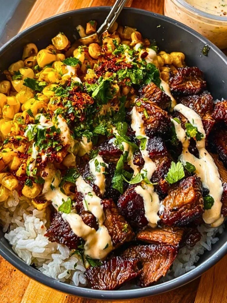 This Korean BBQ Beef Bowl with Corn & Creamy Sauce is a flavor-packed meal that balances sweet, spicy, smoky, and creamy all in one vibrant bowl. Juicy caramelized beef bites lay over a bed of fluffy rice, paired with charred corn, fresh greens, and a tangy sriracha mayo drizzle that ties it all together. It’s street food-style comfort you can enjoy right at home.