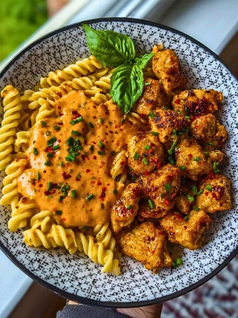 Perfect for weeknights yet elegant enough for guests, these chicken bites are pan-seared to perfection, locking in flavor, while the pasta soaks up every drop of that velvety sauce. The basil garnish adds a fresh, fragrant pop to bring it all together.
