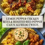 Imagine tender, golden-browned chicken bites coated in zesty lemon pepper seasoning, paired with rotini pasta swirled in a creamy roasted red pepper Cajun Alfredo sauce. This dish balances bright citrusy heat with rich, smoky creaminess, creating a meal that feels both comforting and exciting.