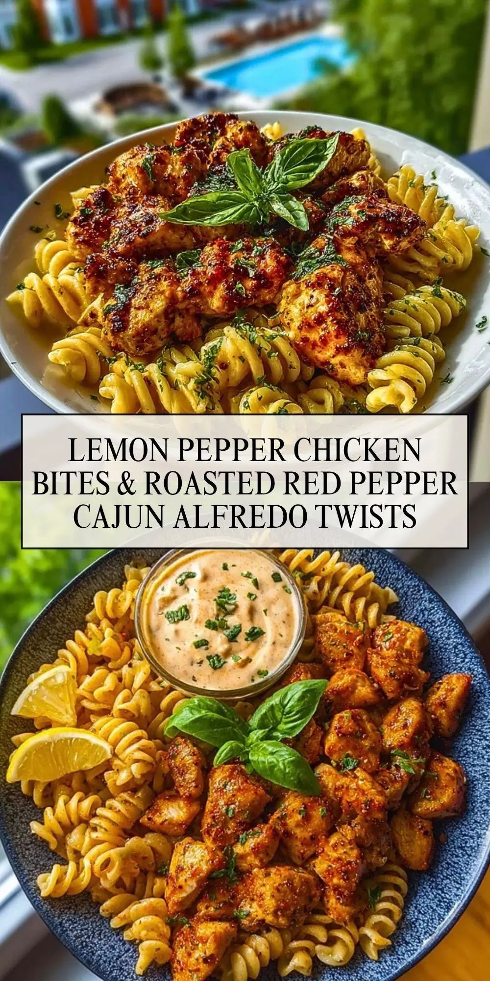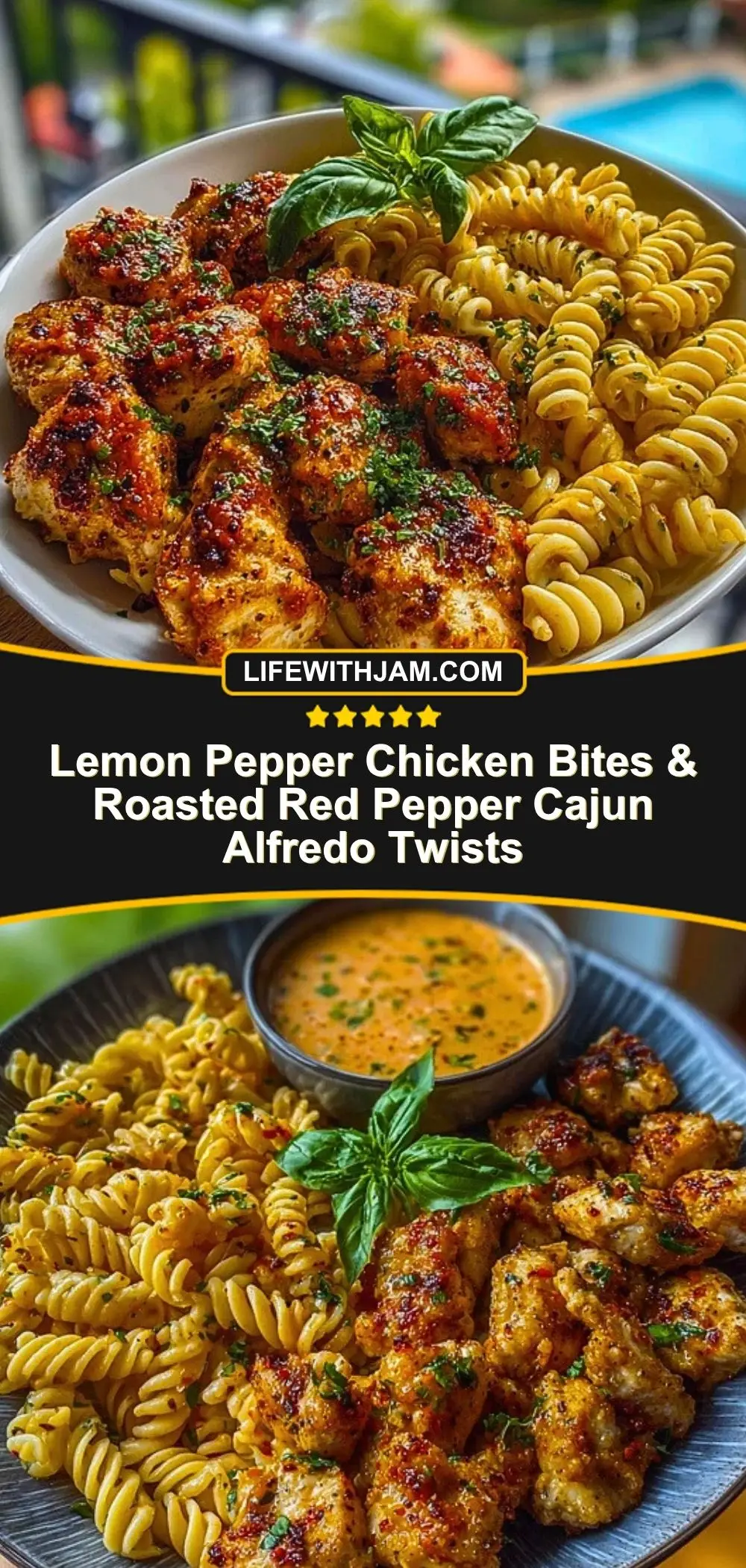 Lemon Pepper Chicken Bites & Roasted Red Pepper Cajun Alfredo Twists