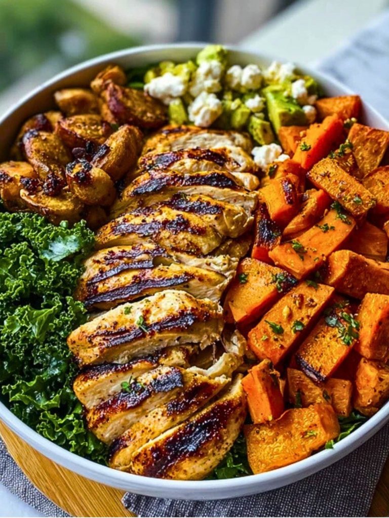 Power up your plate with this Loaded Grilled Chicken & Sweet Potato Power Bowl — a vibrant, wholesome, flavor-packed dish that delivers on both nourishment and comfort. Juicy grilled chicken breast is seasoned to perfection and paired with roasted sweet potatoes, crisp kale, creamy avocado slices, and a drizzle of tangy dressing. It’s the kind of bowl that makes healthy eating feel indulgent and entirely satisfying.