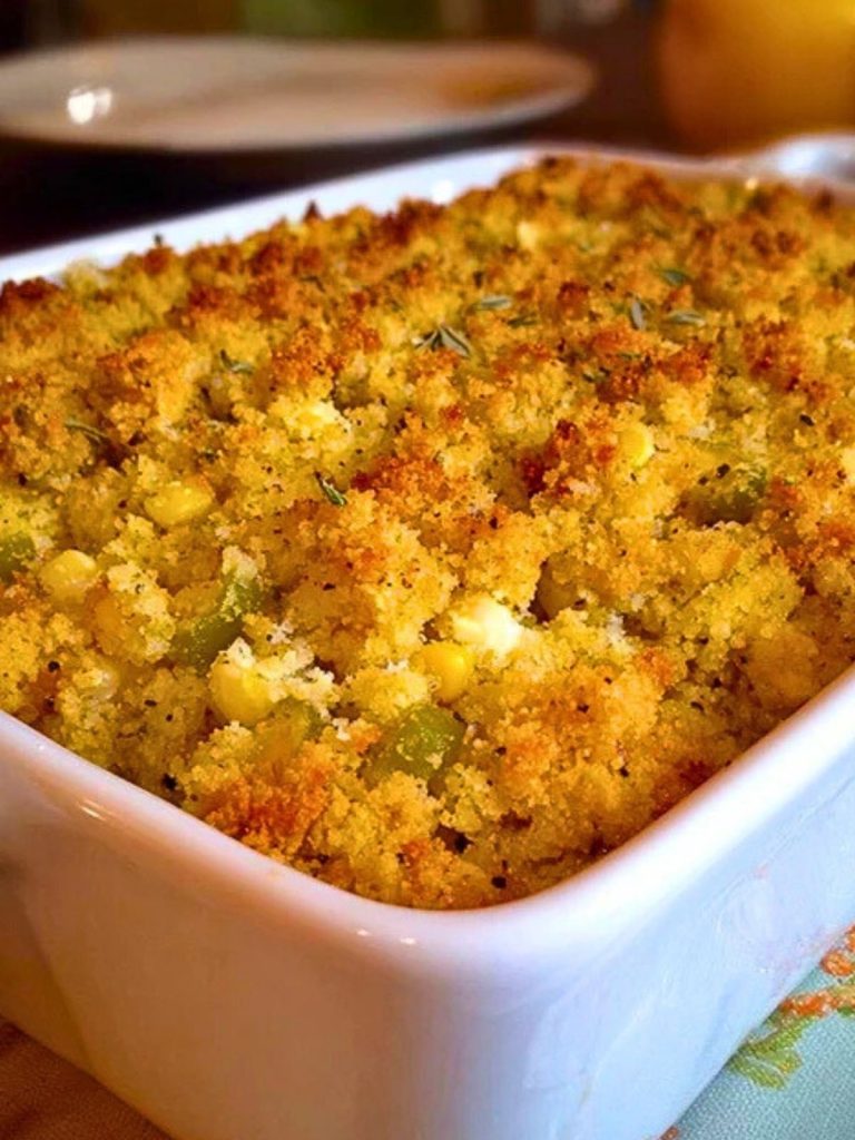 Made with a base of homemade (or shortcut) cornbread, this dressing is richly seasoned, dotted with tender celery and sweet corn, and baked until beautifully crisp on top. Whether you’re gathering around for Thanksgiving or simply craving Southern comfort, this dressing is the kind of dish that brings people together, plate after plate.