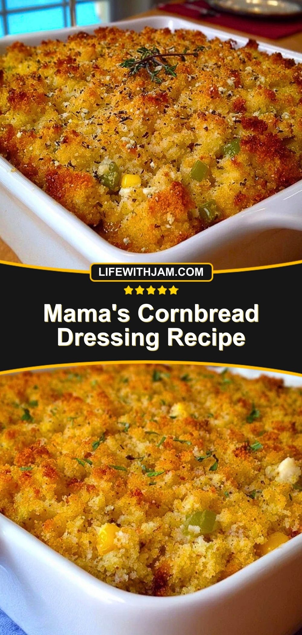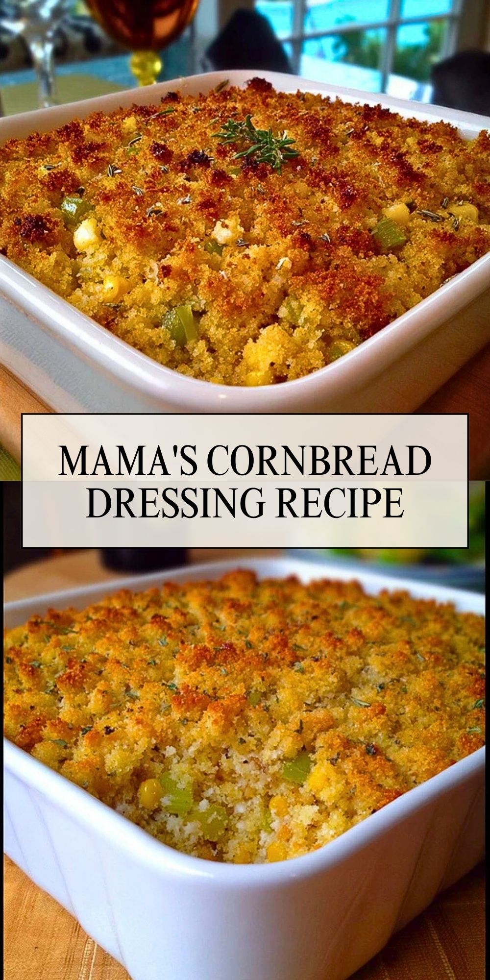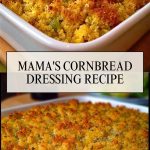 Mama’s Cornbread Dressing is a rich and savory Southern classic made with crumbled cornbread, sautéed vegetables, herbs, and a golden crispy top. Perfect for holidays or comforting weeknight dinners, it’s flavorful, moist inside, and crunchy on the edges—just like mama made it.
