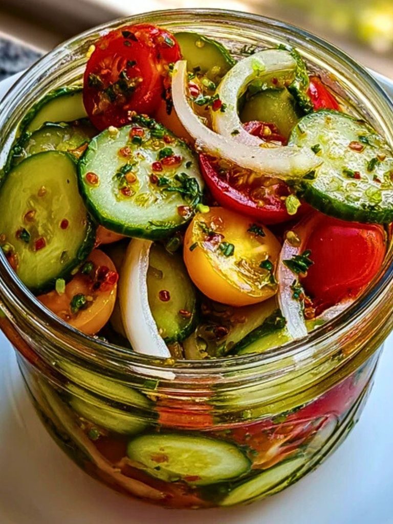 Looking for a side dish that feels like summer in a jar? This vibrant bowl of Marinated Cucumbers, Onions, and Tomatoes is exactly that. Crisp cucumbers, juicy tomatoes, and sharp onions soak in a tangy, herb-packed marinade, creating a refreshing burst of flavor with every bite. Whether you’re heading to a picnic, grilling out with friends, or just want something light and delicious for lunch, this quick salad brings brightness and crunch to the table.