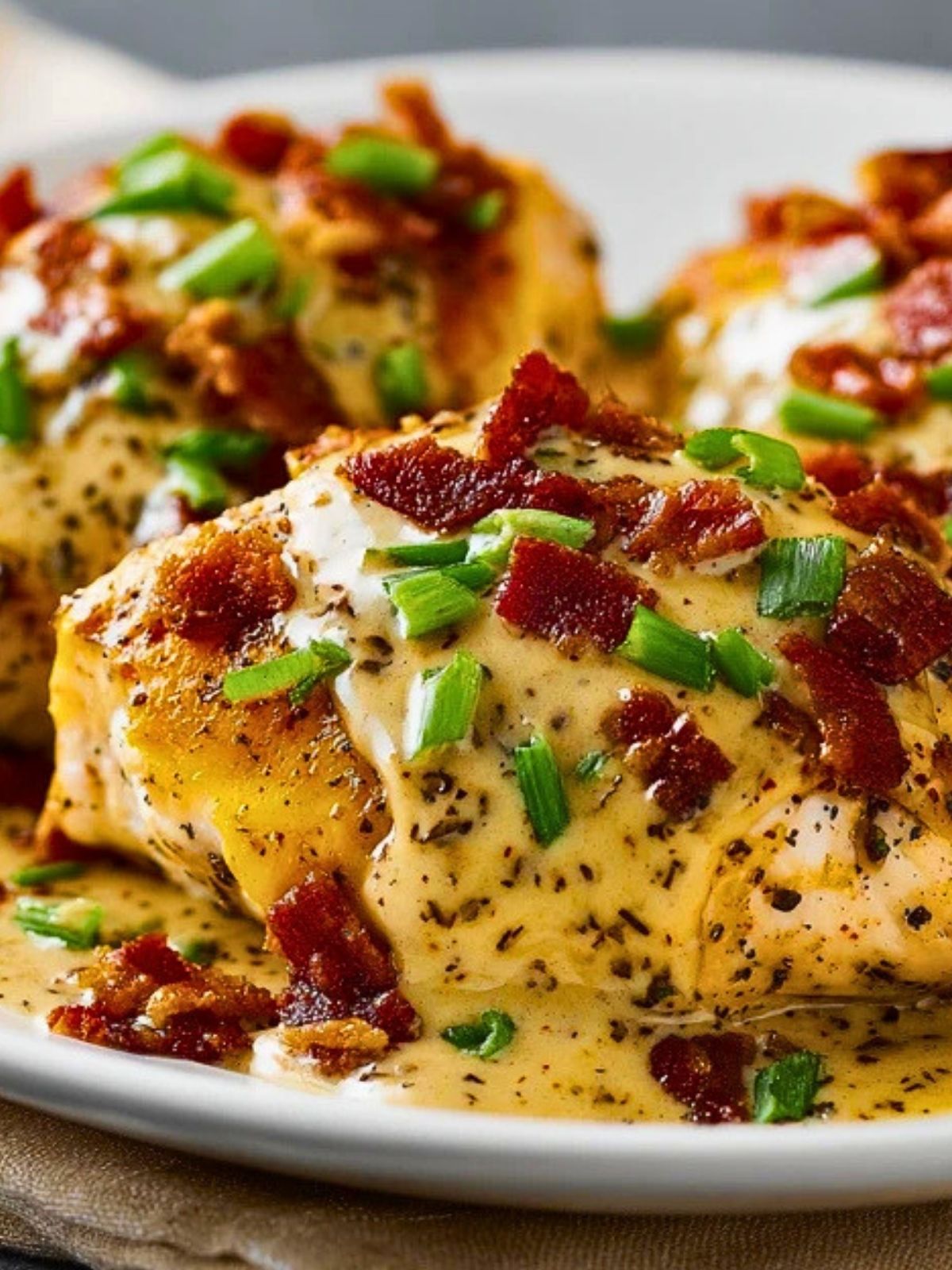 This chicken recipe leans into creamy ranch-style flavor, gooey cheese, crispy bacon, and a generous finish of green onions. The result is a baked chicken dinner that tastes big with very little fuss.