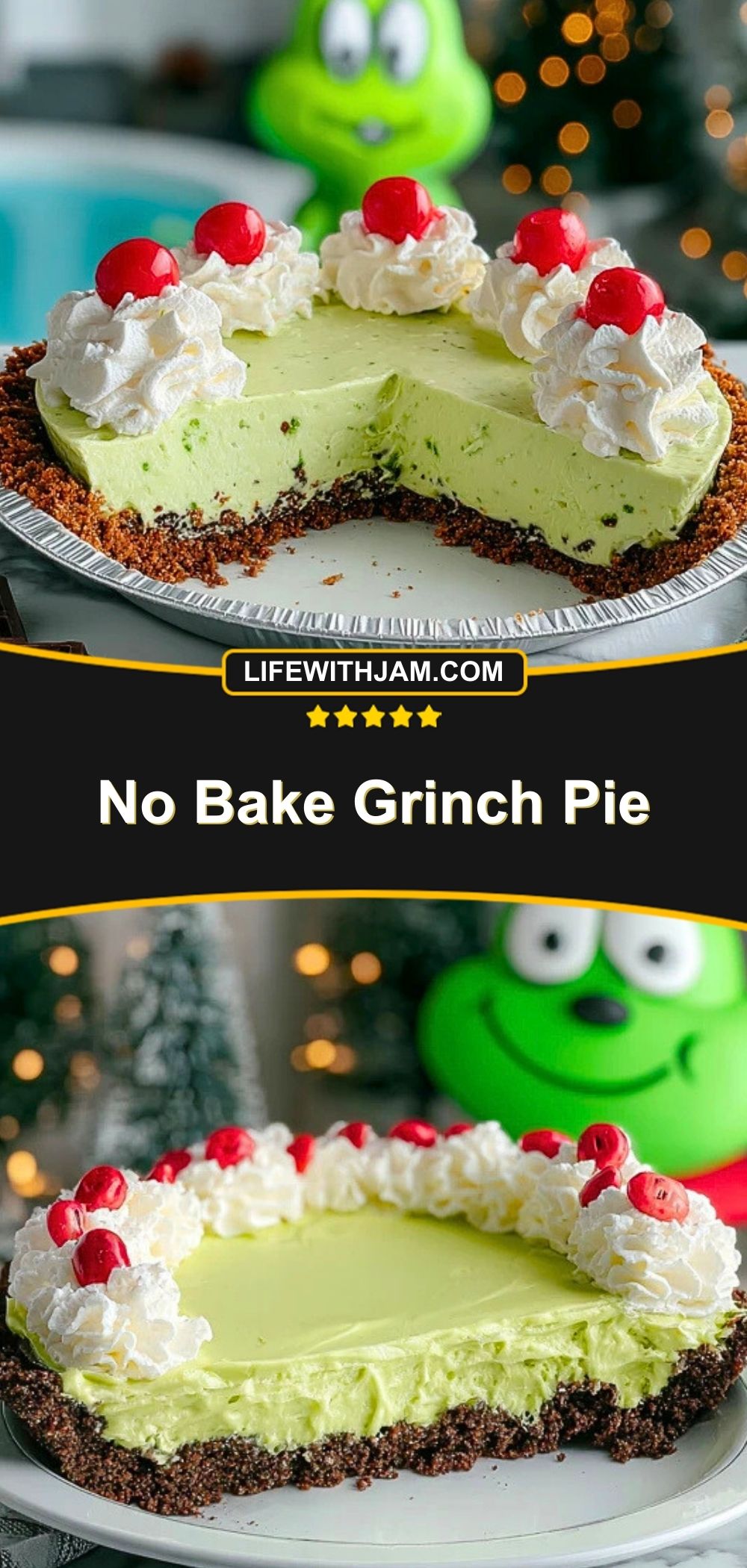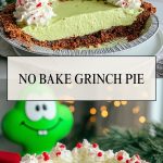 Serve the No Bake Grinch Pie chilled straight from the fridge for the creamiest texture. Slice it with a sharp knife and wipe between cuts for clean edges. It pairs beautifully with hot cocoa, a mug of peppermint coffee, or even eggnog.