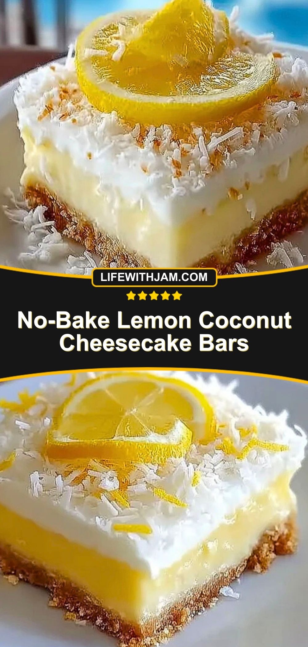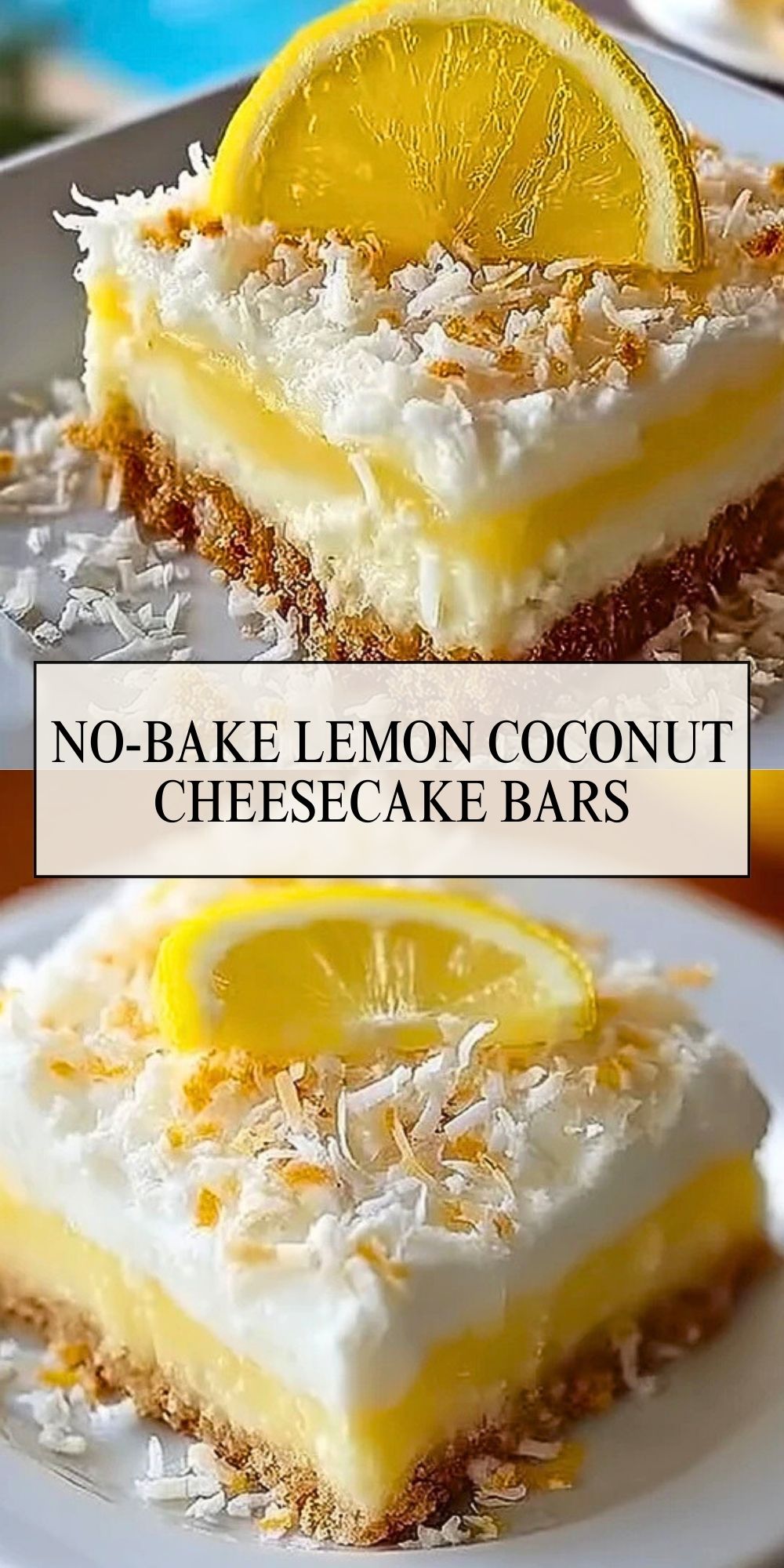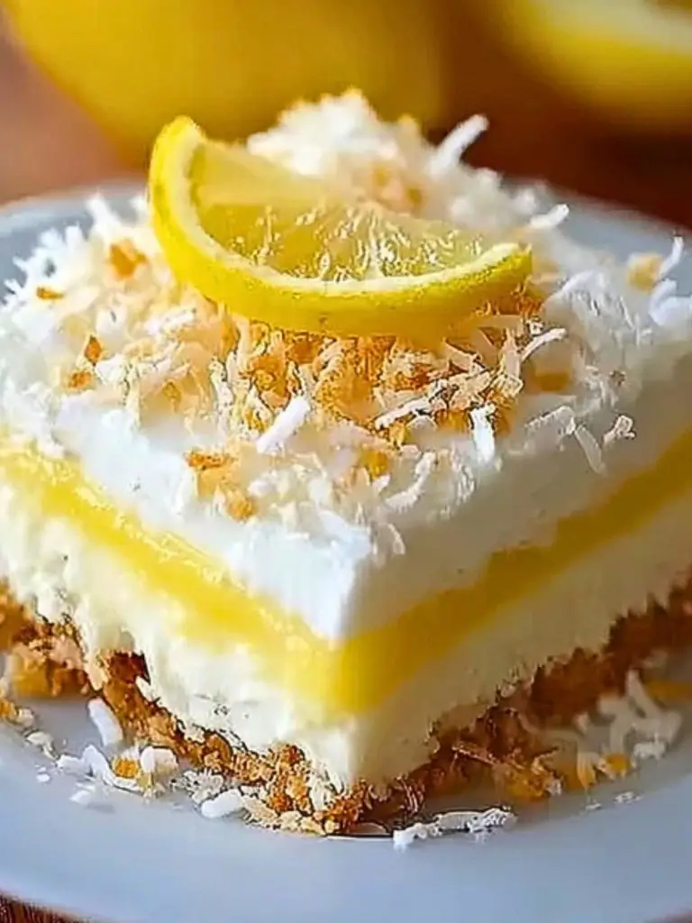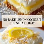 These No-Bake Lemon Coconut Cheesecake Bars are a cool, creamy, and vibrant dessert with a tropical twist. A coconut-infused graham cracker crust supports a fluffy cheesecake layer and zesty lemon pudding. Perfect for summer days, gatherings, or anytime you want something sweet without turning on the oven.