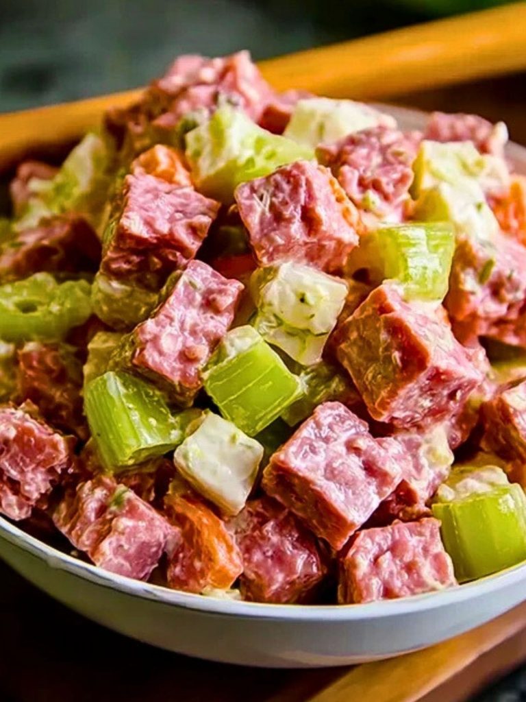 Old-Fashioned Bologna Salad is one of those nostalgic, creamy dishes that instantly transports you back to grandma’s kitchen table. With its bright pink cubes of bologna, crunchy celery, and sweet pickle relish all tied together in a creamy mayonnaise dressing, it’s the kind of retro favorite that deserves a comeback. It’s perfect as a sandwich filling, cracker spread, or straight from the bowl with a fork.