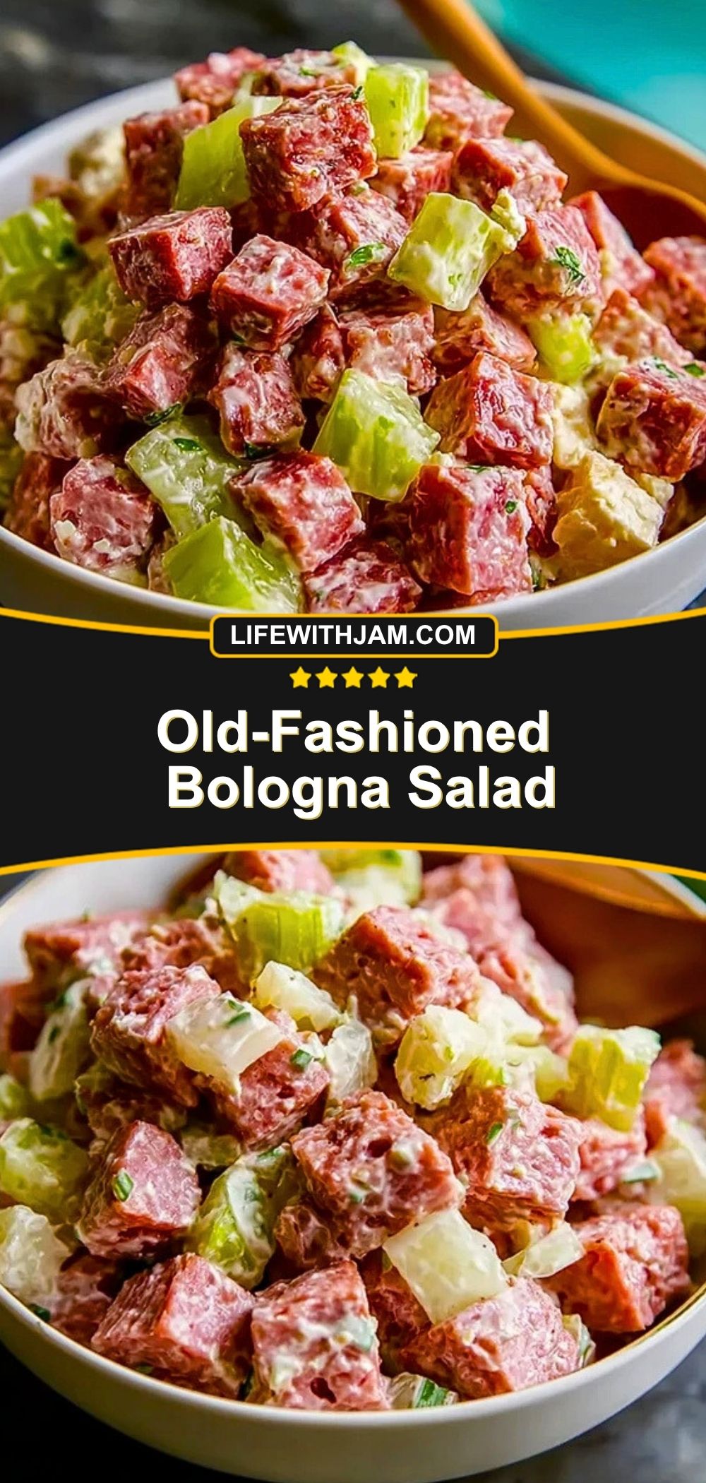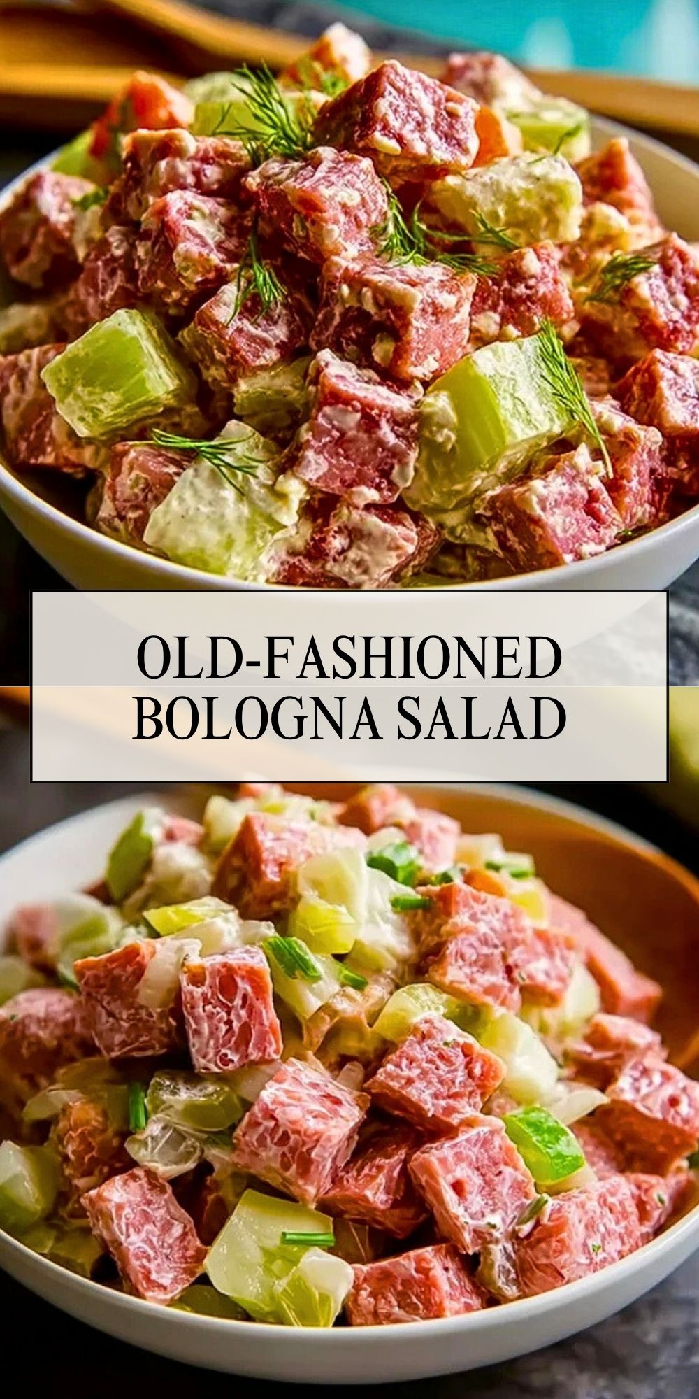 Old-Fashioned Bologna Salad is a creamy, savory, and crunchy retro classic made with diced bologna, celery, and sweet pickle relish, all tossed in a tangy mayonnaise-mustard dressing. It’s perfect for sandwiches, crackers, or just straight out of the bowl!