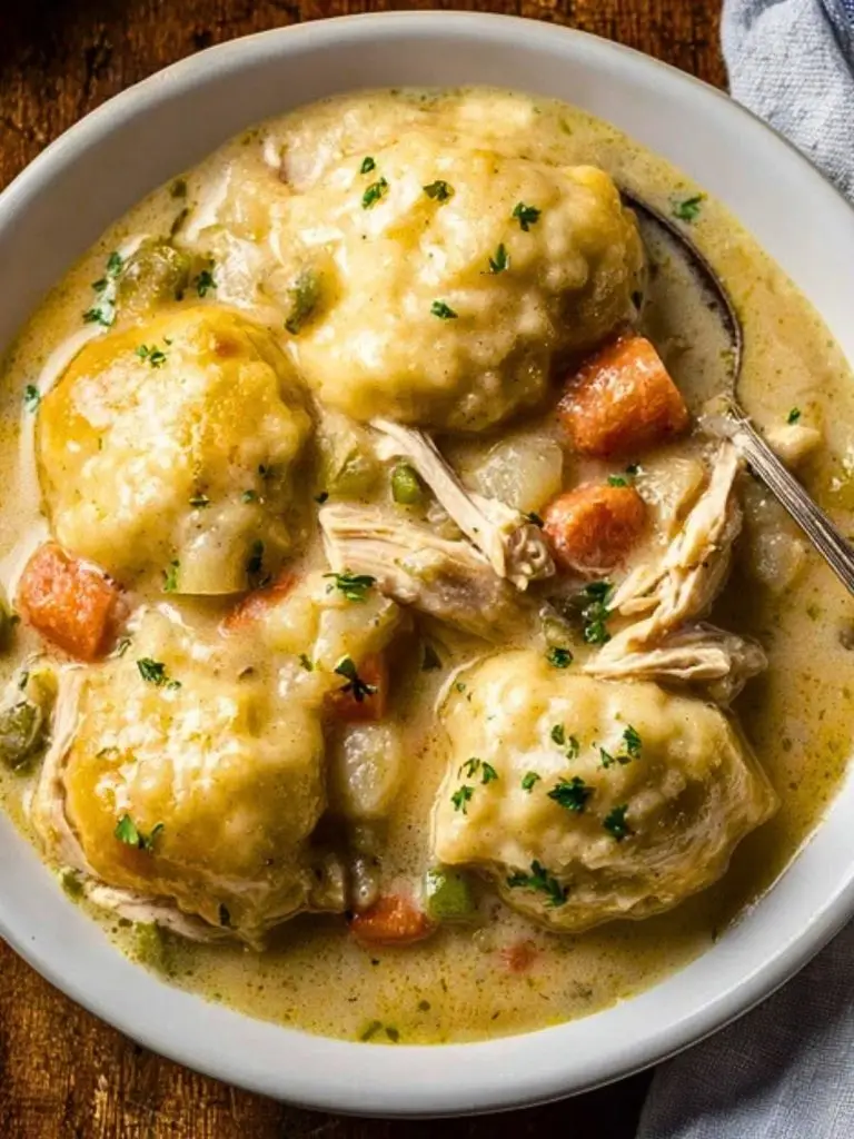 This dish is best served piping hot straight from the pot. Scoop generous portions of the creamy chicken stew with a couple of dumplings into wide bowls. A sprinkle of fresh parsley adds a pop of color and freshness that complements the rich broth. Serve with a side of crusty bread if you’re feeling extra indulgent.