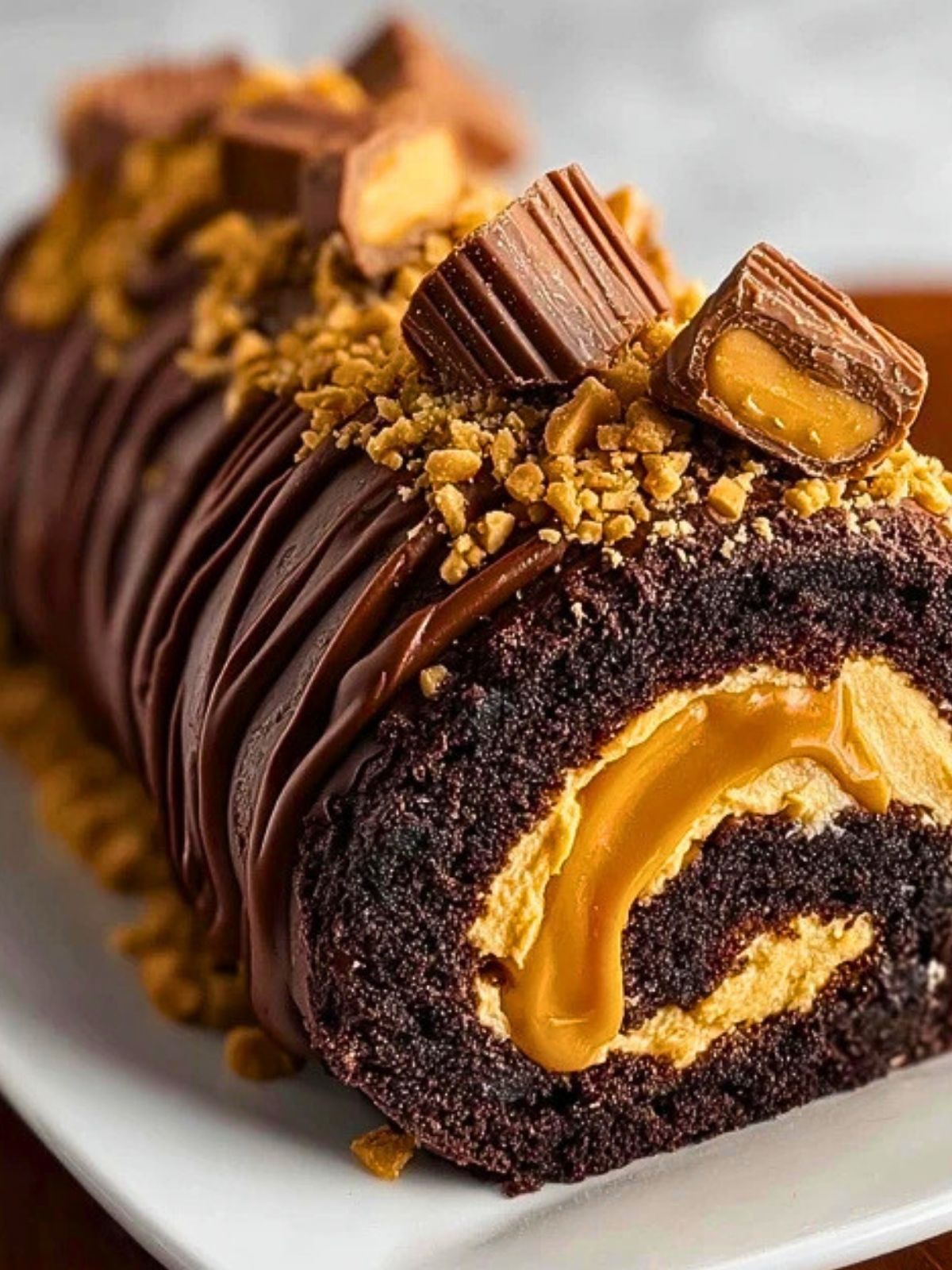 Rich, decadent, and made to impress—this Peanut Butter Cup Chocolate Roll Cake is what dessert dreams are made of. Imagine a moist chocolate sponge wrapped around a whipped peanut butter cream filling, swirled with a ribbon of silky caramel, all draped in ganache and topped with chopped peanut butter cups. It’s a showstopper that tastes even better than it looks.