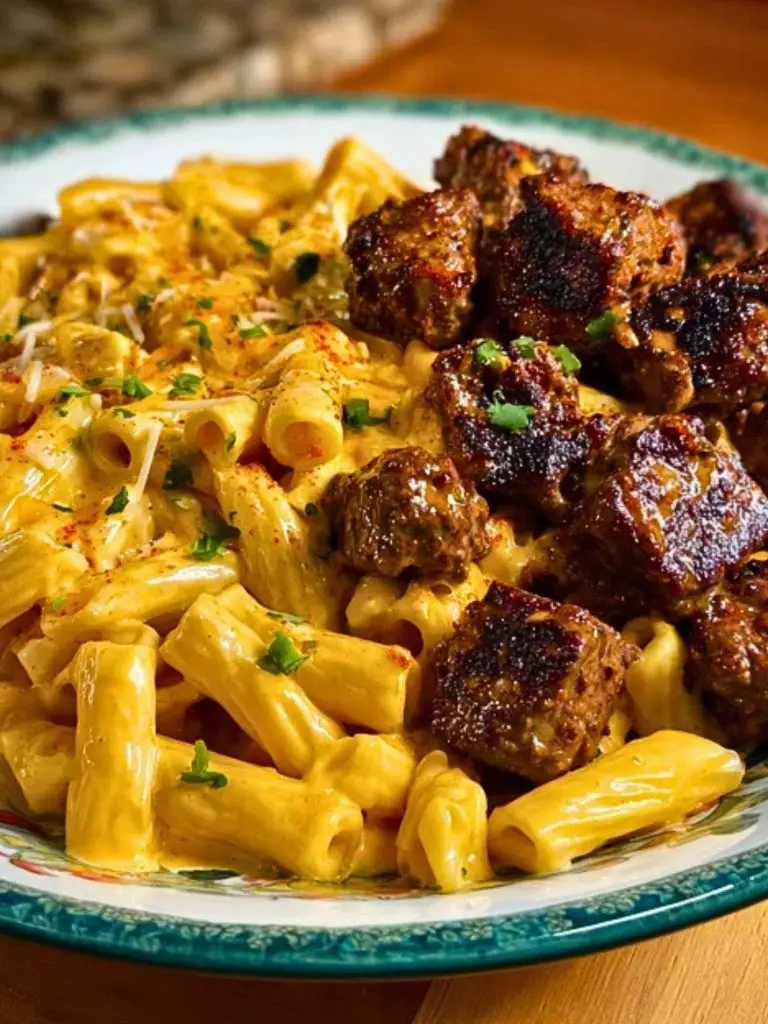 The penne is bathed in a decadent sauce made from Velveeta Four-Cheese, giving it a melt-in-your-mouth creaminess that clings to every bite. On the side, Cajun-seasoned beef cubes are seared until crusty on the outside, yet tender and juicy within, adding smoky spice and meaty depth that perfectly balances the richness of the pasta.