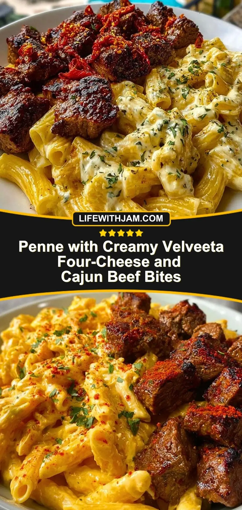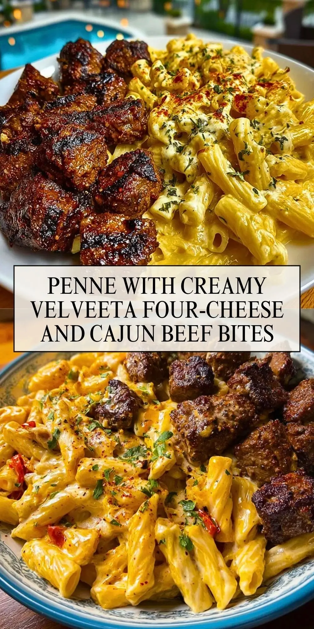 A rich and comforting pasta dish featuring penne coated in a creamy Velveeta Four-Cheese sauce, paired with tender Cajun-seasoned beef bites for a spicy, savory kick.