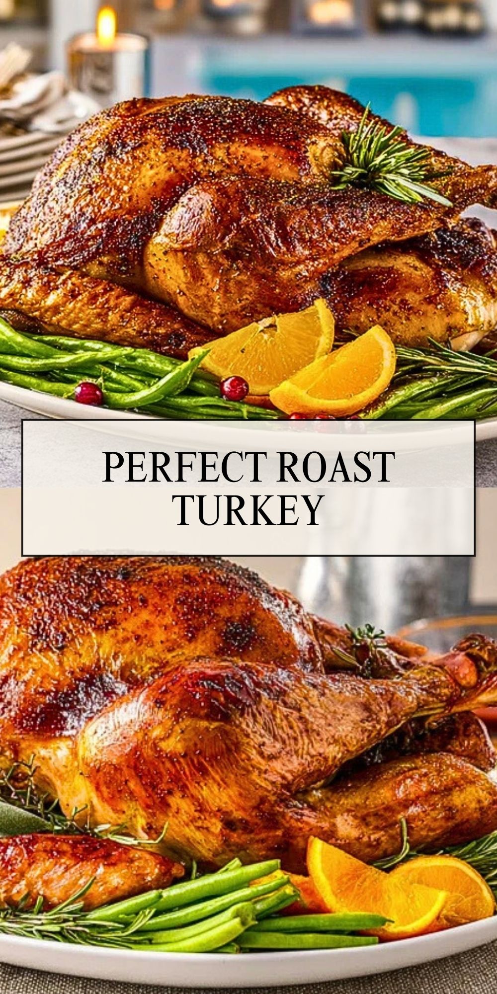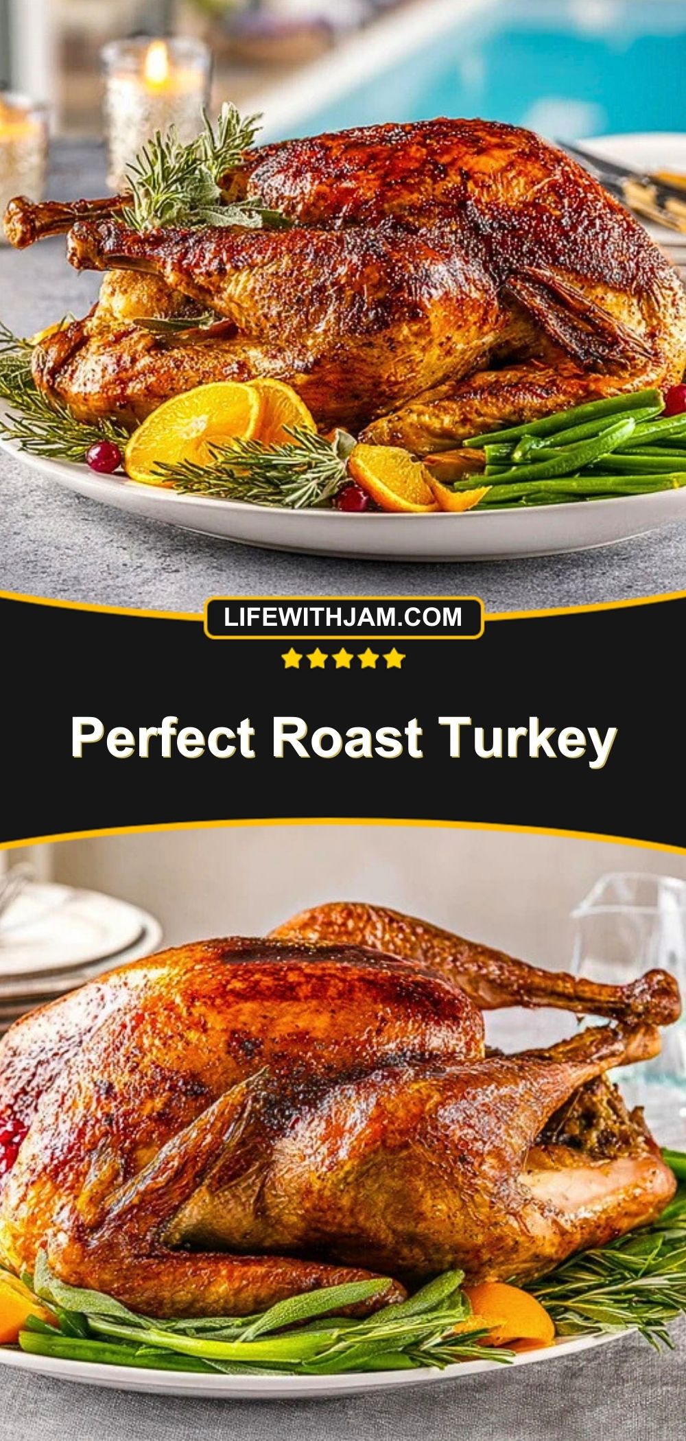 Serve your Perfect Roast Turkey on a large platter garnished with fresh herbs and citrus slices for a beautiful presentation. Pair it with classics like mashed potatoes, stuffing, cranberry sauce, and gravy made from the pan drippings.