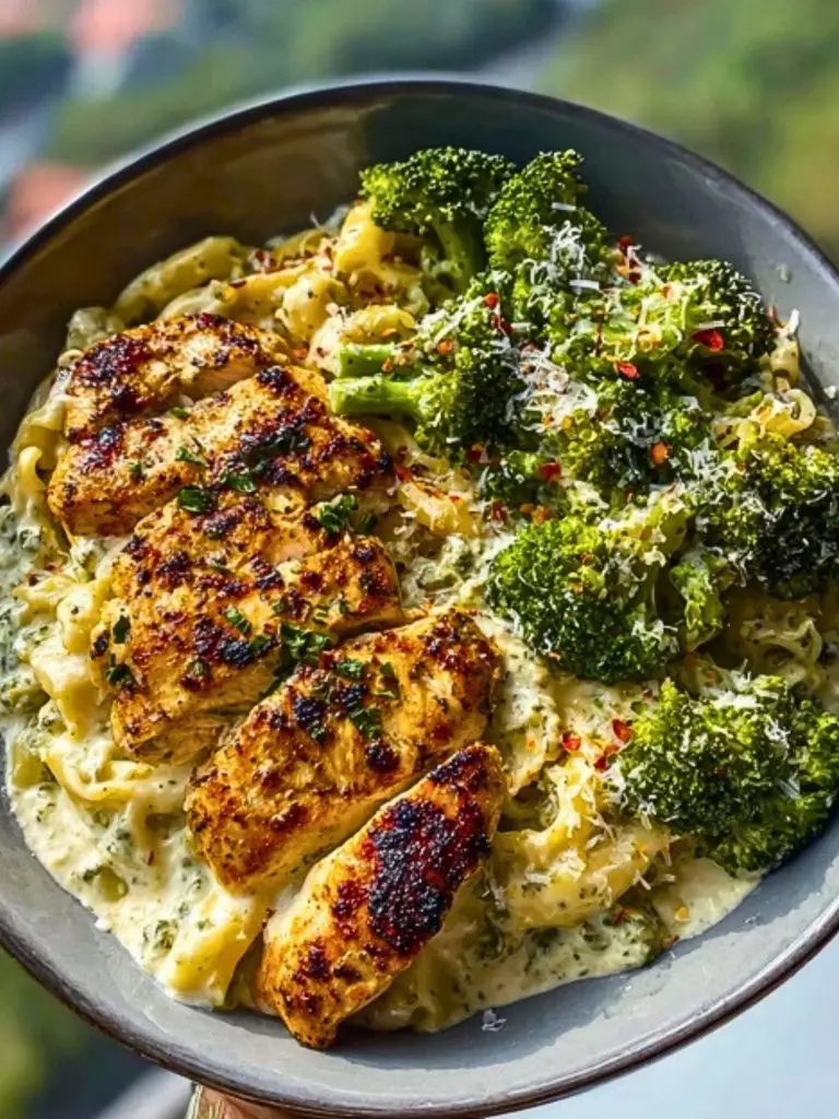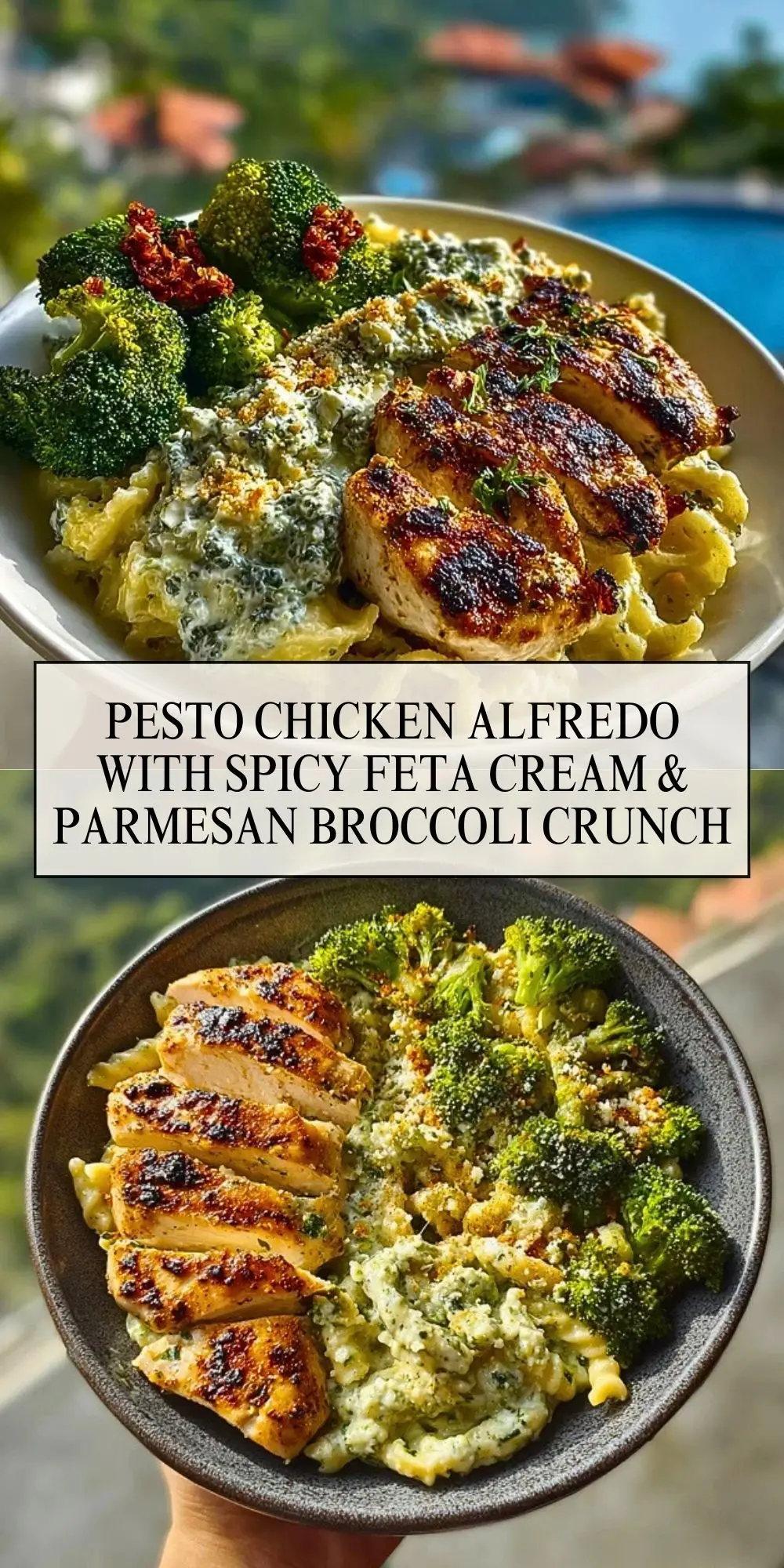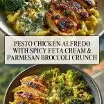 This Pesto Chicken Alfredo with Spicy Feta Cream & Parmesan Broccoli Crunch is the kind of dinner that makes you want to cancel your takeout plans forever. Picture tender, grilled chicken breast with golden char marks nestled next to velvety Alfredo infused with pesto, a spicy feta cream that adds just the right zing, and a crunchy, oven-roasted broccoli topping dusted in Parmesan. It’s an explosion of flavor and texture in every bite.