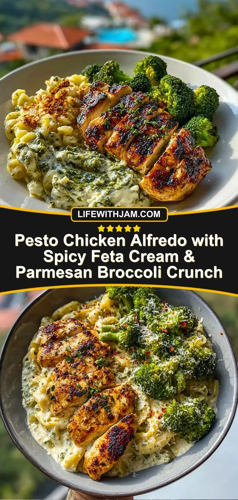 Pesto Chicken Alfredo with Spicy Feta Cream & Parmesan Broccoli Crunch