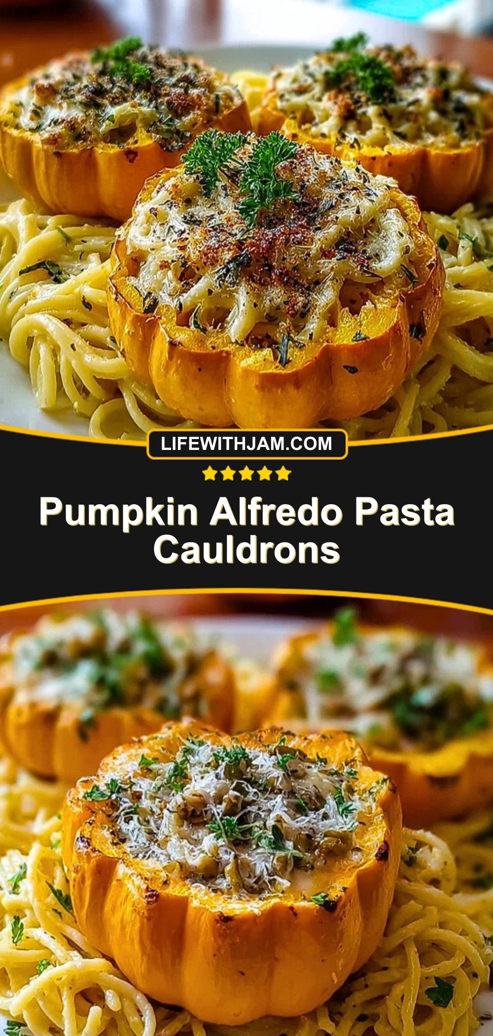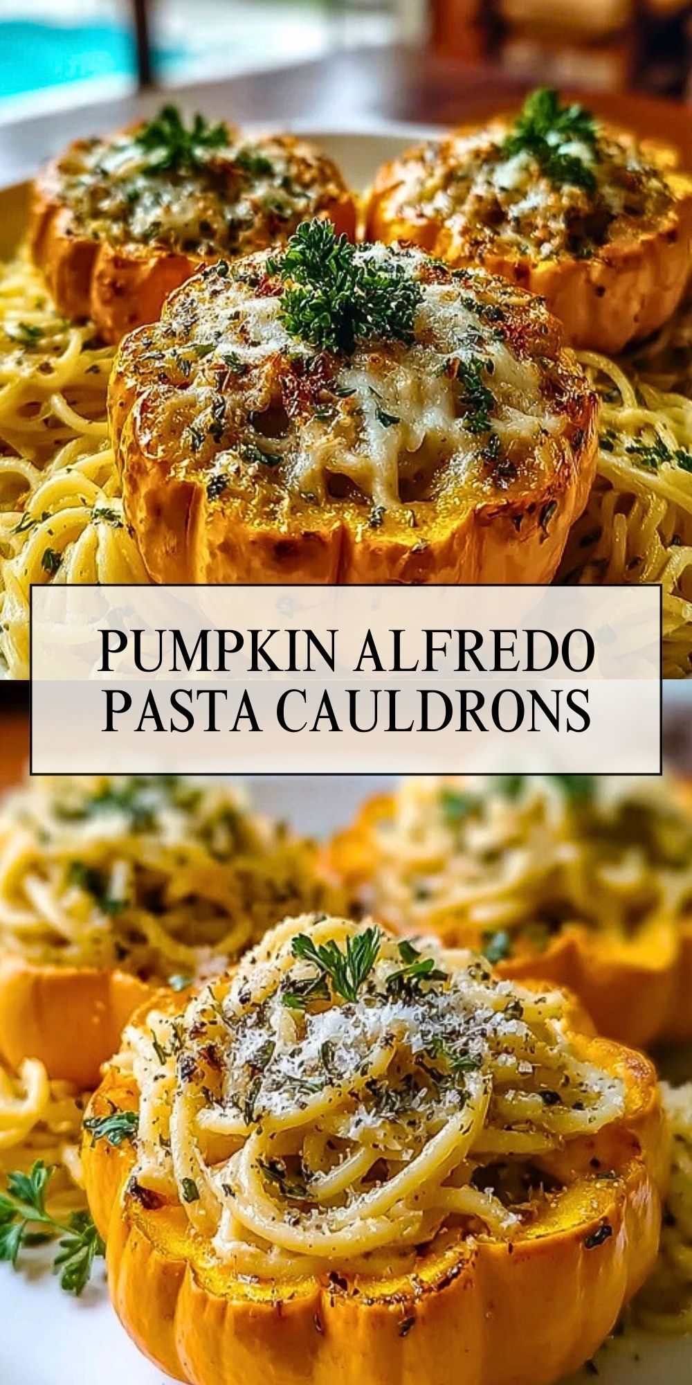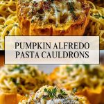 These pasta-filled pumpkin cauldrons are best served immediately while warm, when the Alfredo is creamy and the roasted pumpkin is tender but structured. Pair them with a crisp green salad or roasted Brussels sprouts for a cozy autumn meal.