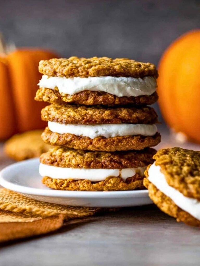 Old-fashioned rolled oats are ideal for this recipe. They give the cookies a hearty texture that holds up beautifully with the soft pumpkin base and thick cream filling. Quick oats tend to make cookies more uniform and cake-like, but for that chewy, rustic feel, stick with rolled oats.