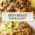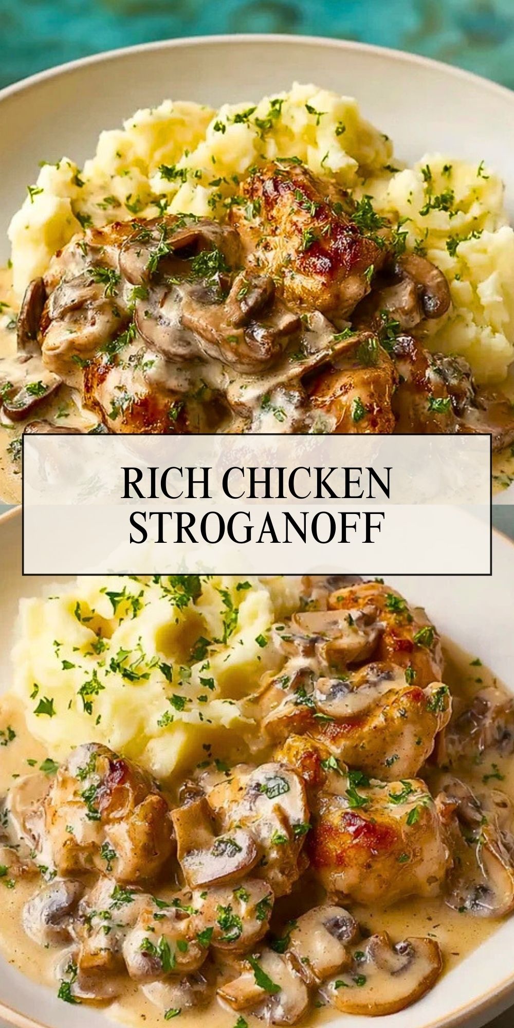 Rich Chicken Stroganoff is a creamy, savory dinner loaded with tender chicken thighs and mushrooms in a velvety sauce. It’s easy enough for a busy weeknight yet rich and comforting like a Sunday meal. Serve it over mashed potatoes, egg noodles, or rice for the perfect cozy dinner.