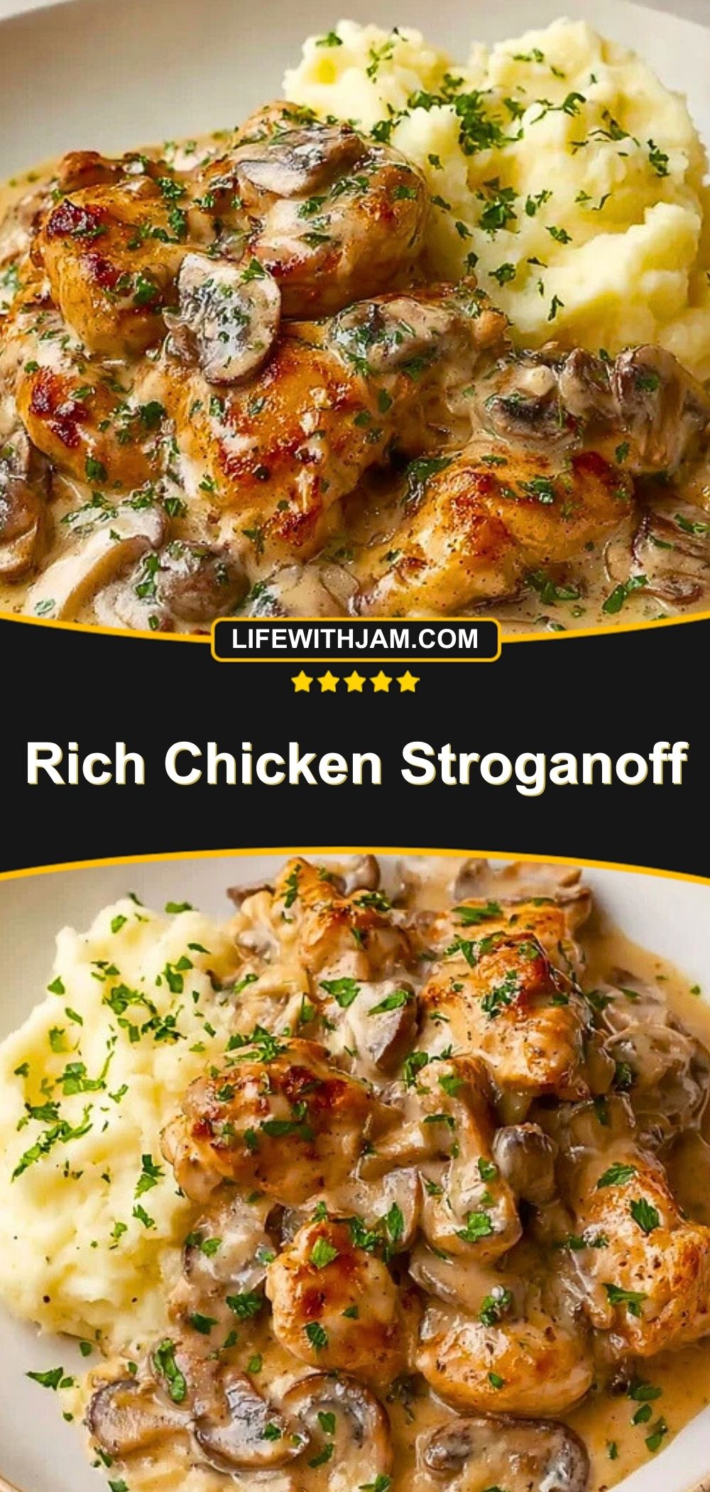 Creamy, cozy, and packed with rich, savory flavor—this Rich Chicken Stroganoff is the comfort food you didn’t know you were missing. Imagine tender chunks of chicken simmered in a velvety mushroom cream sauce, poured generously over a mountain of buttery mashed potatoes or egg noodles. It’s the kind of meal that turns an ordinary weeknight into something special, without needing anything fancy.