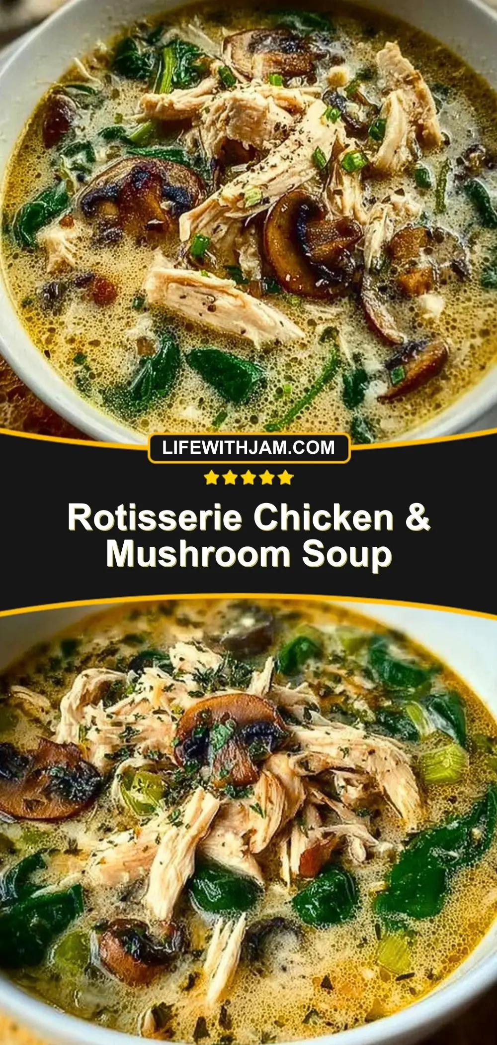Keywords: rotisserie chicken soup, creamy mushroom soup, quick chicken soup, one-pot dinner, comfort food