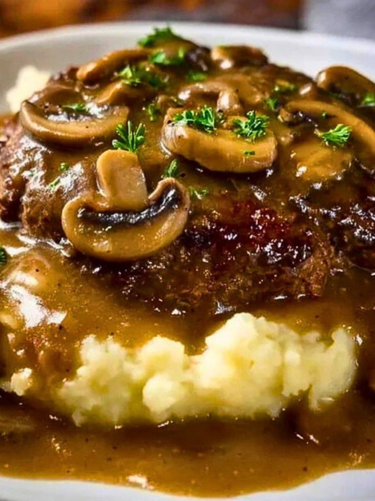 A comforting classic featuring juicy beef patties simmered in savory mushroom gravy, served over creamy mashed potatoes. It’s the ultimate cozy dinner that tastes like home.