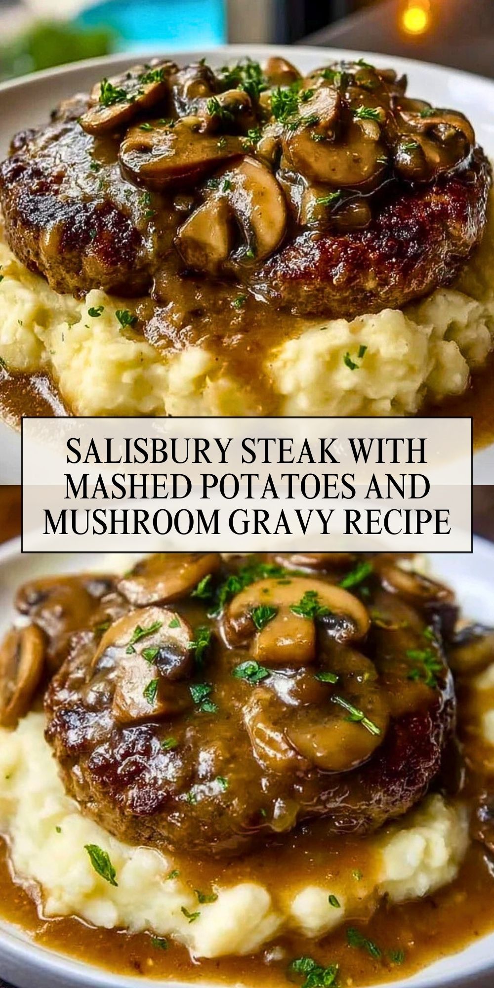 Spoon a generous scoop of mashed potatoes onto each plate. Top with a Salisbury steak patty and ladle over that rich, savory mushroom gravy. Garnish with fresh parsley if desired.
