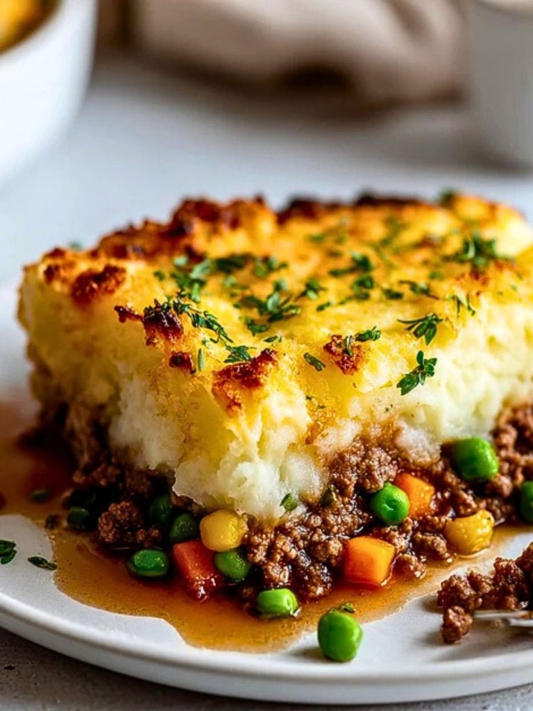 Shepherd’s Pie is best served fresh from the oven when the mashed potato topping is golden and slightly crisp. Scoop generous portions into bowls or plates and enjoy it on its own or with a side of crusty bread or a light green salad for contrast. A sprinkle of fresh herbs like parsley or thyme adds color and freshness right before serving.
