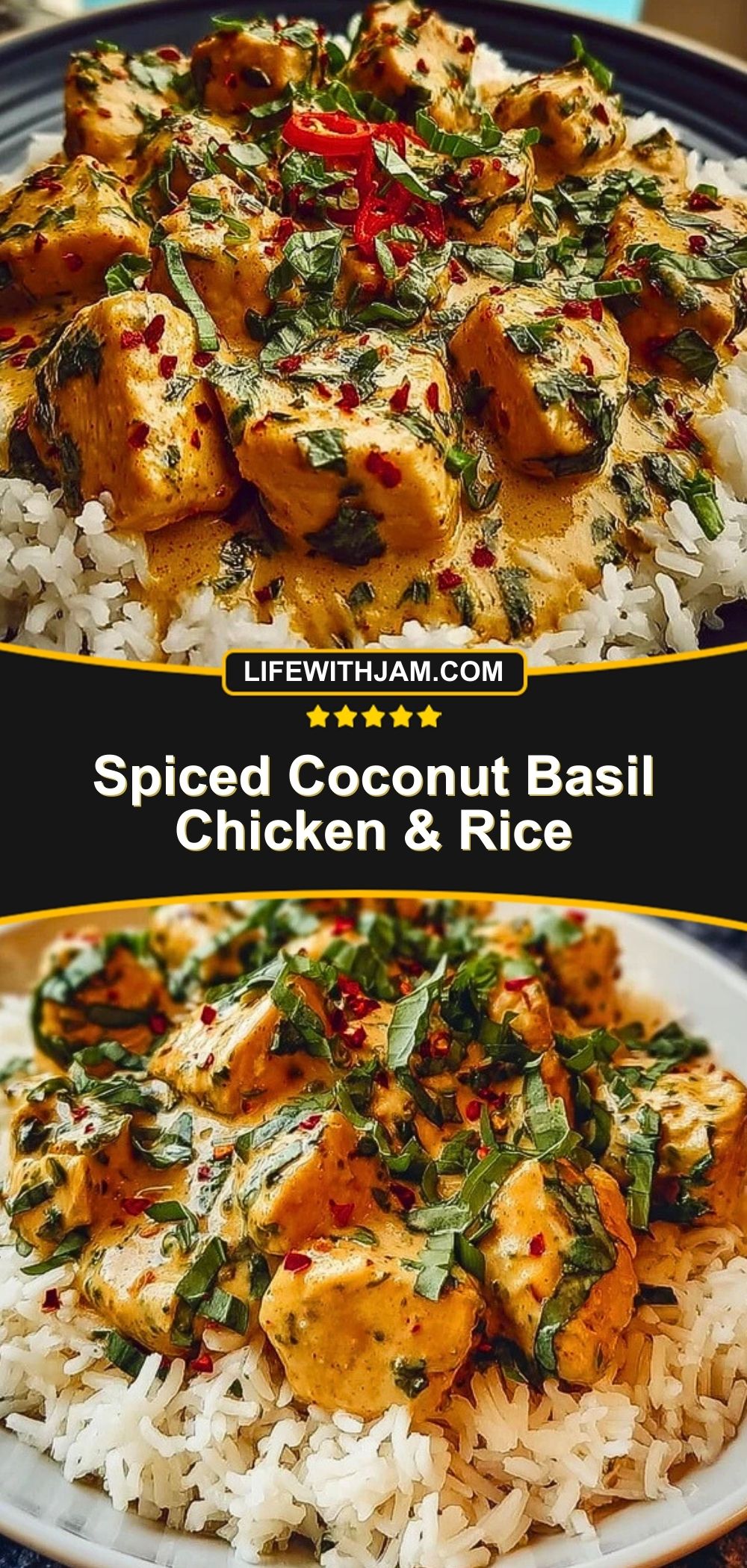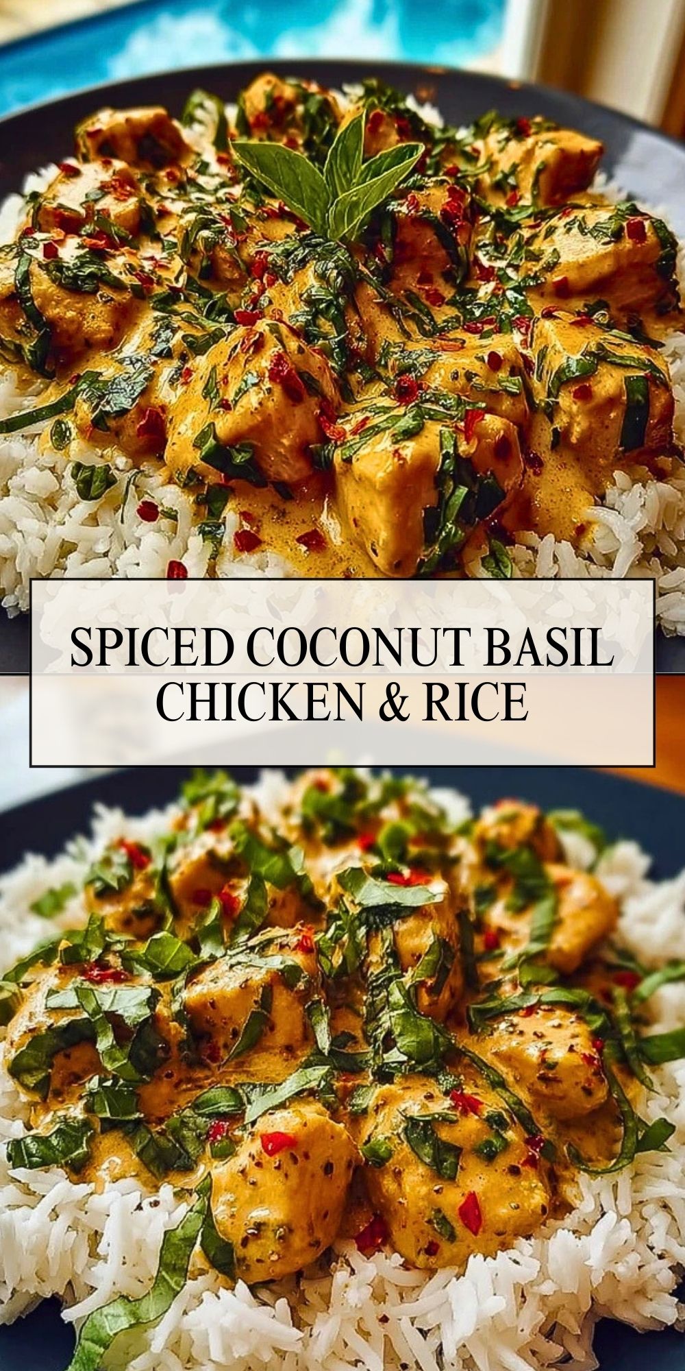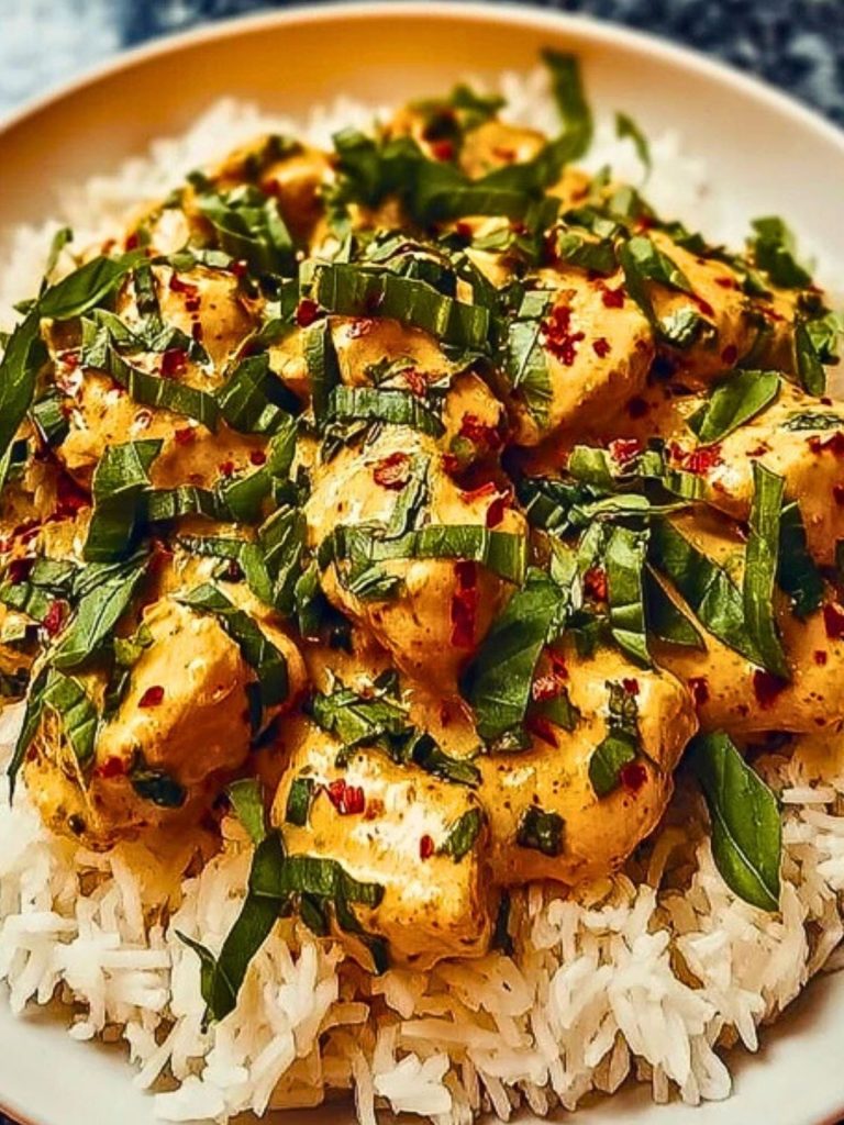 Creamy, spicy, and bursting with flavor—this Spiced Coconut Basil Chicken & Rice is your next weeknight favorite. Juicy chicken chunks simmered in a rich coconut cream sauce, infused with garlic, red pepper flakes, and fresh basil, all served over fluffy white rice. It’s comforting and satisfying with just the right amount of heat.