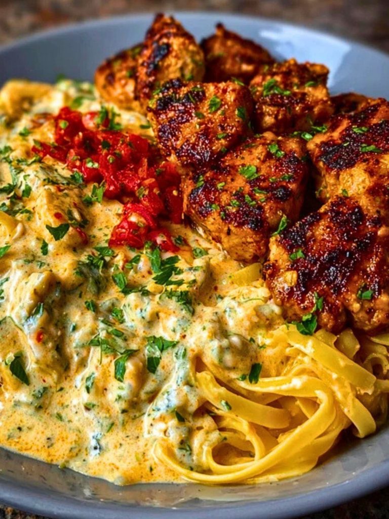 Creamy and spicy with rich garlic butter flavor, this indulgent pasta dish features golden-seared chicken over tender linguine tossed in a luscious four-cheese sauce. Perfect for cozy dinners or crowd-pleasing meals.