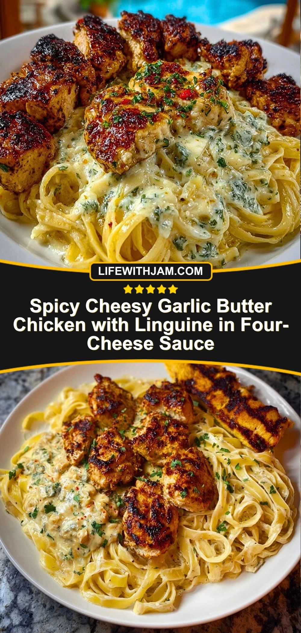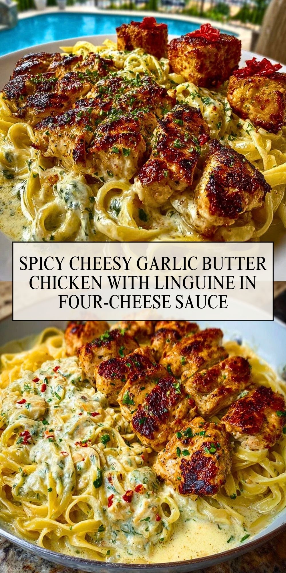 Creamy, spicy, garlicky, and absolutely irresistible—this Spicy Cheesy Garlic Butter Chicken with Linguine in Four-Cheese Sauce is the ultimate indulgence for pasta and chicken lovers. Perfectly seared, juicy chunks of seasoned chicken sit atop a bed of tender linguine drenched in a rich, velvety four-cheese sauce. A touch of heat and lots of garlicky goodness bring this dish to a whole new level.