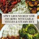 Keywords: ground beef bowl, stir fry, quick dinner, garlic veggies, spicy rice bowl